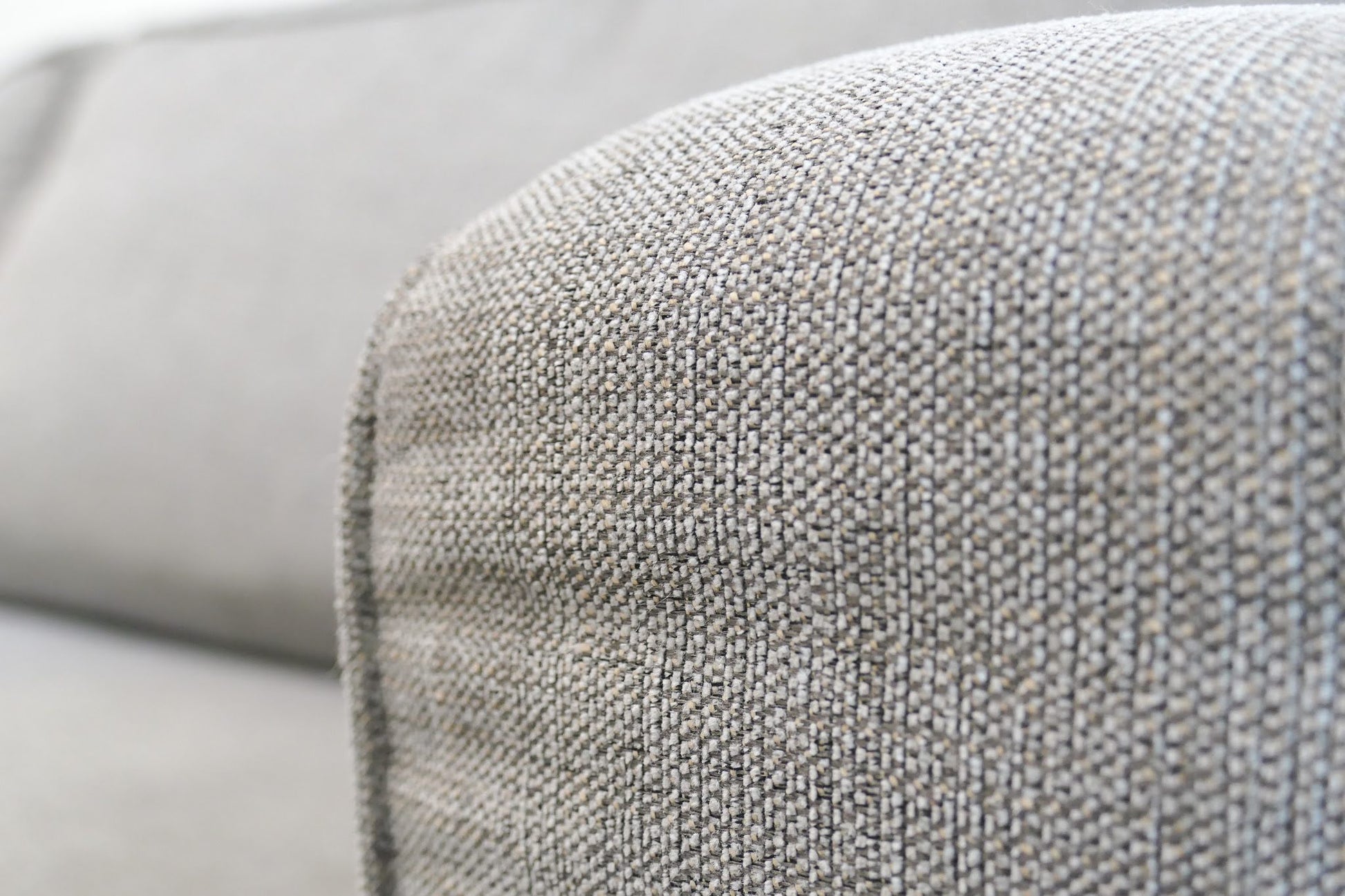 Grijze hoekbank met een lichte brons-tint, uitgevoerd met afneembare rugkussens. De bank zit comfortabel en is technisch in goede staat, met enkel wat normale gebruikssporen op het zitvlak.