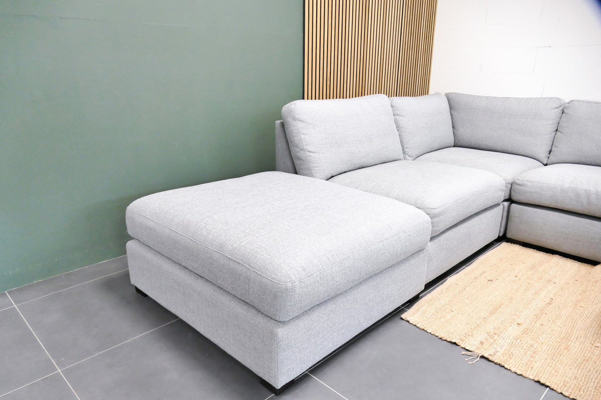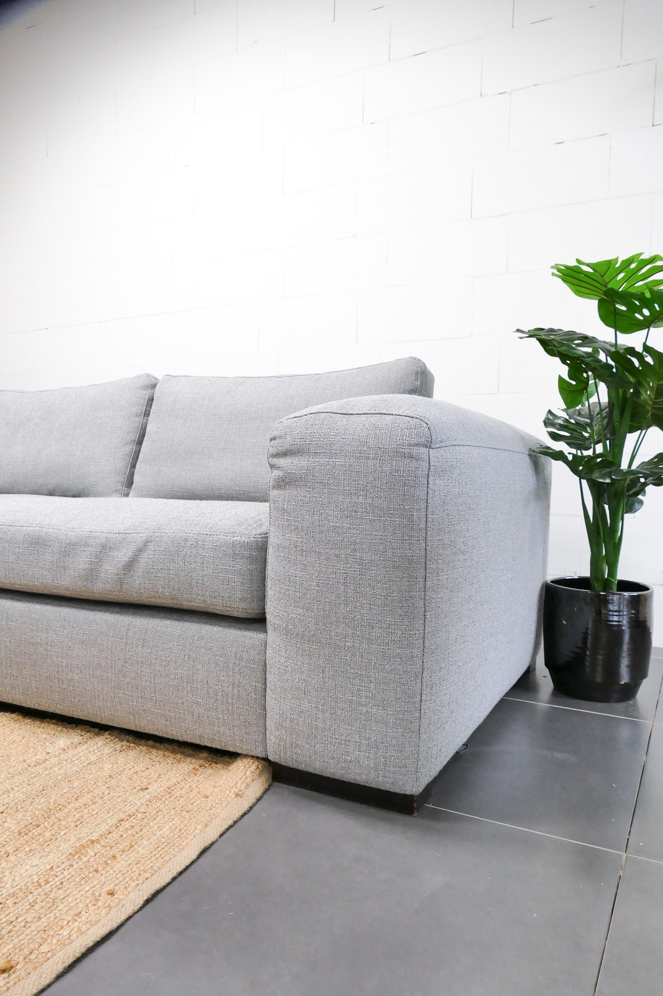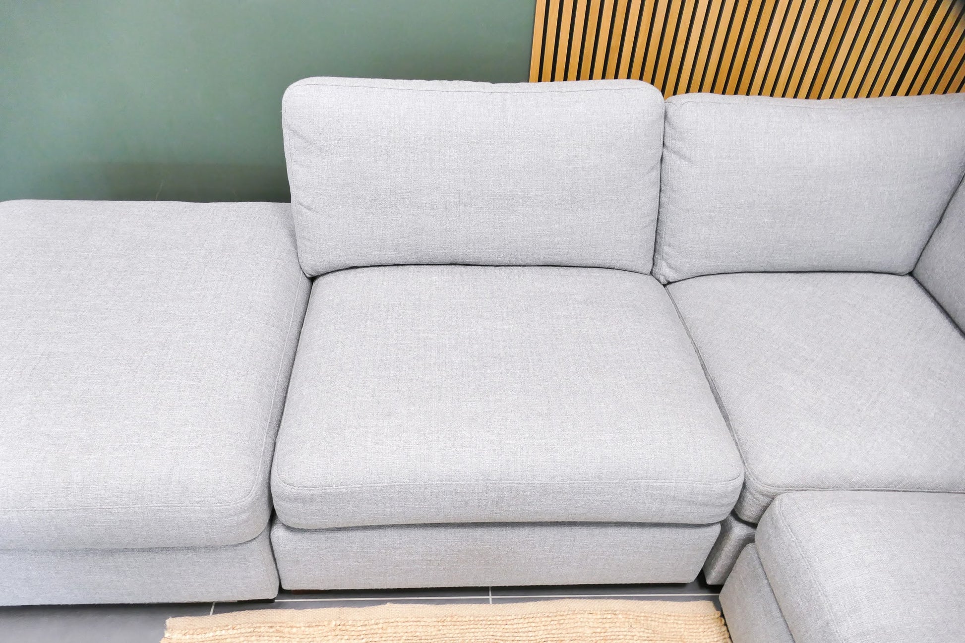 Luxe Montèl Infinity Square hoekbank in een grijze gemêleerde stof met een royale loungezit. De bank is opgevuld met Polypress voor langdurig ondersteunend zitcomfort en heeft zitvlakken van kwalitatief koudschuim. Dankzij het modulaire ontwerp, afneembare hoofd- en rugkussens en diepe zit is deze hoekbank perfect voor wie houdt van relaxen in stijl. De bank verkeert in uitstekende staat, vergelijkbaar met een showroommodel.