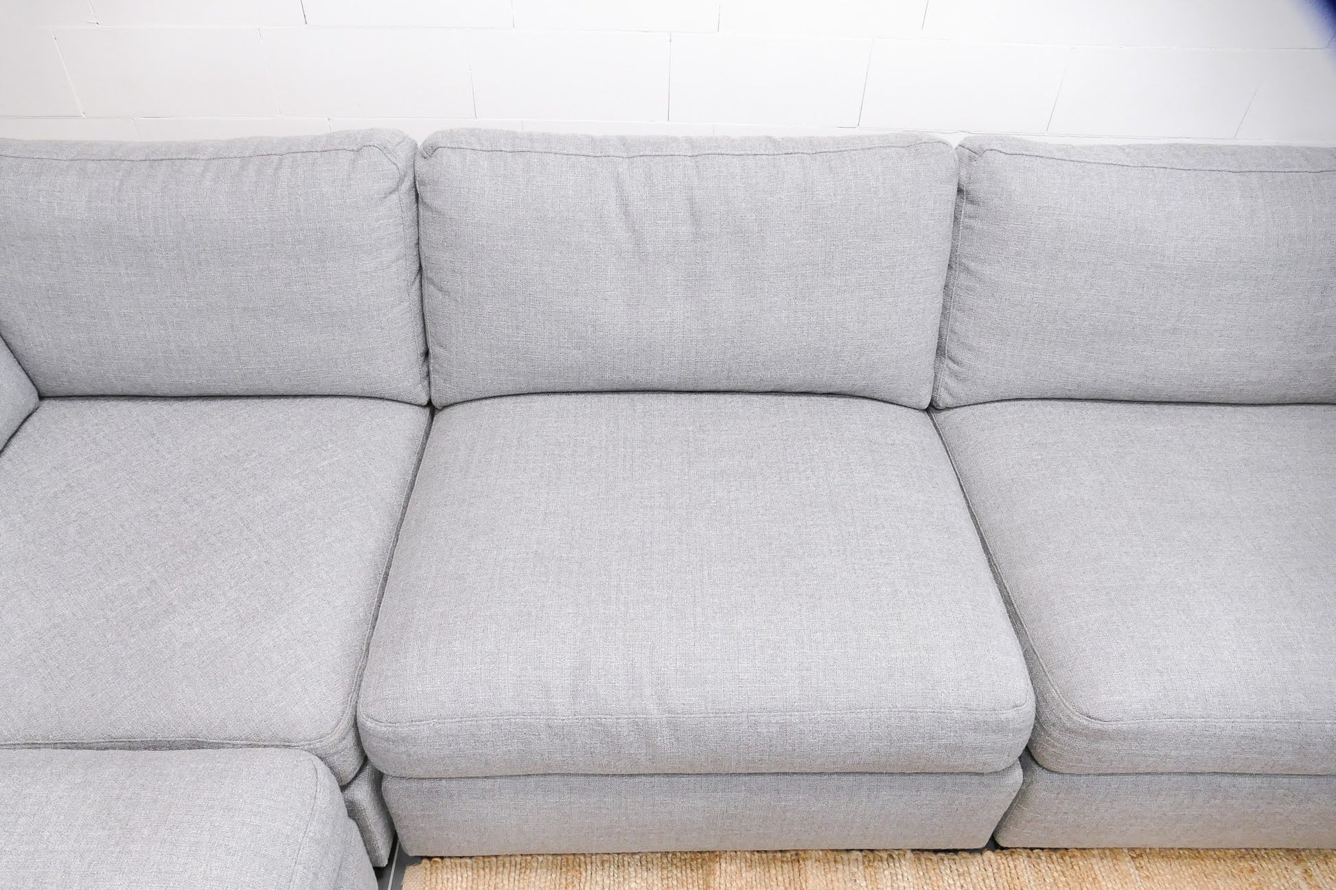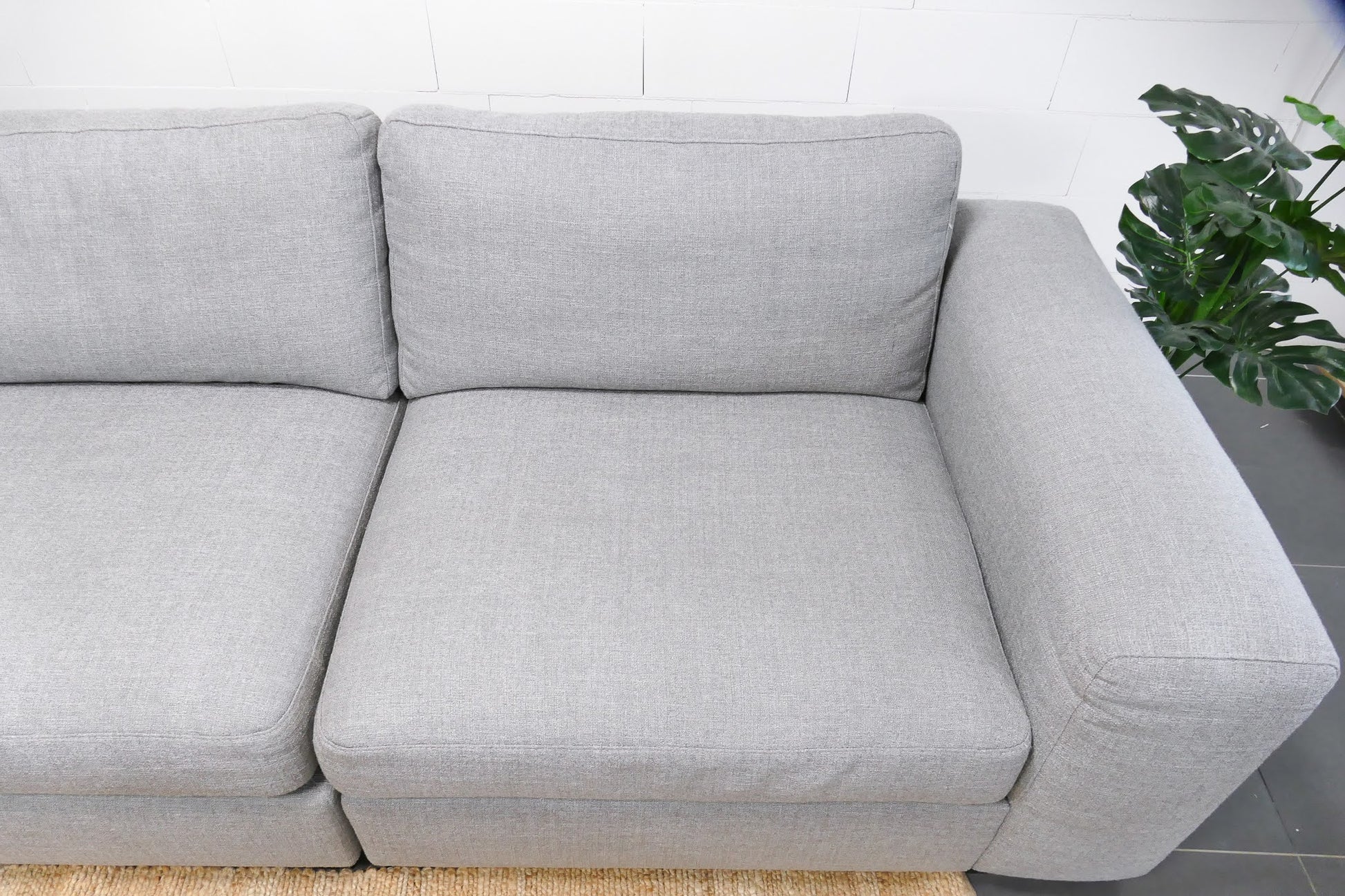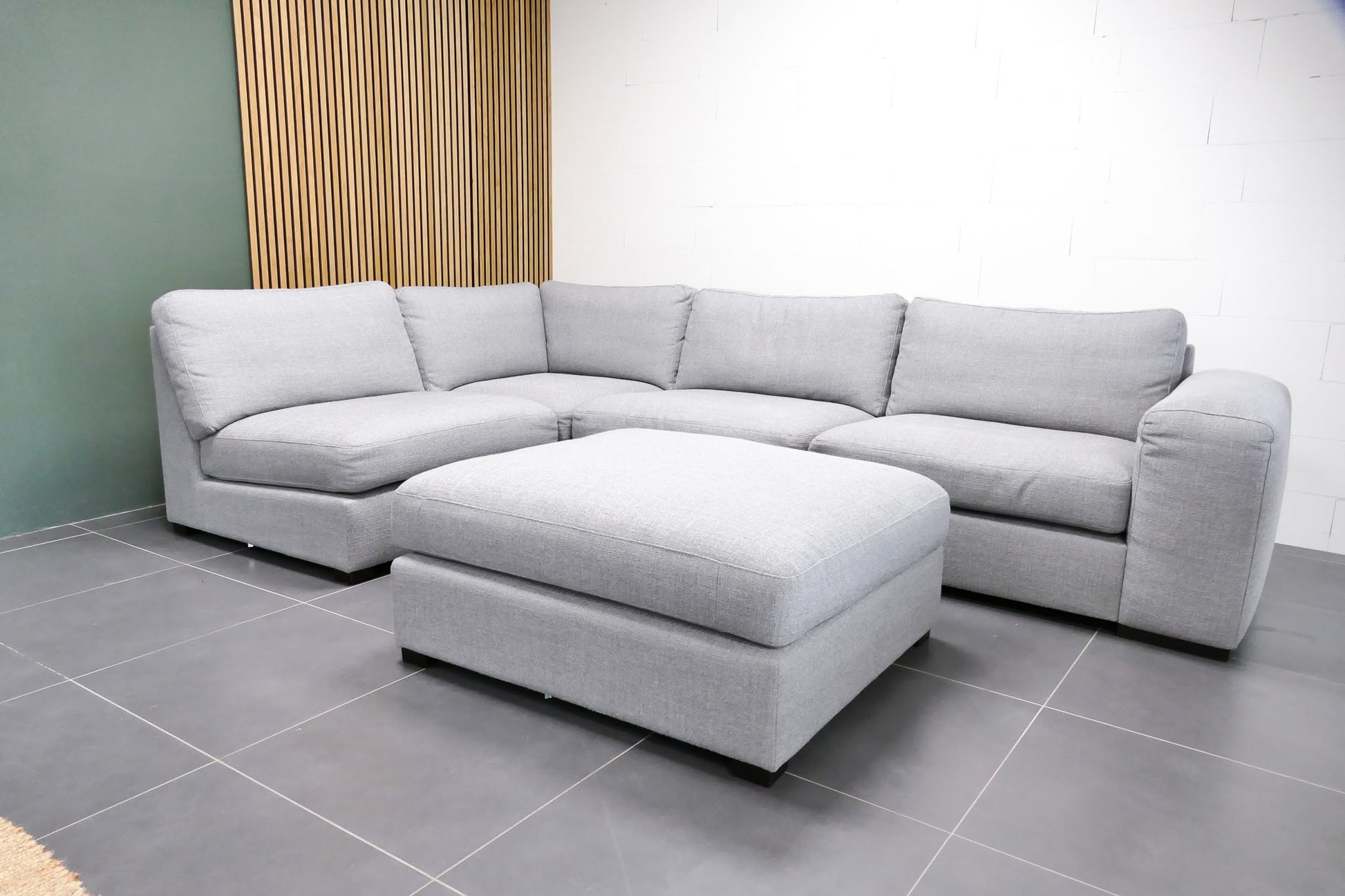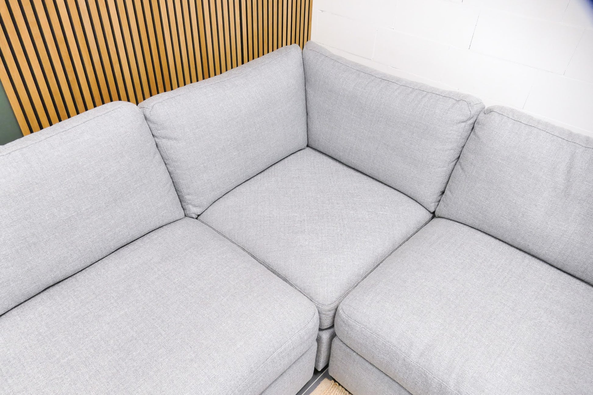 Luxe Montèl Infinity Square hoekbank in een grijze gemêleerde stof met een royale loungezit. De bank is opgevuld met Polypress voor langdurig ondersteunend zitcomfort en heeft zitvlakken van kwalitatief koudschuim. Dankzij het modulaire ontwerp, afneembare hoofd- en rugkussens en diepe zit is deze hoekbank perfect voor wie houdt van relaxen in stijl. De bank verkeert in uitstekende staat, vergelijkbaar met een showroommodel.