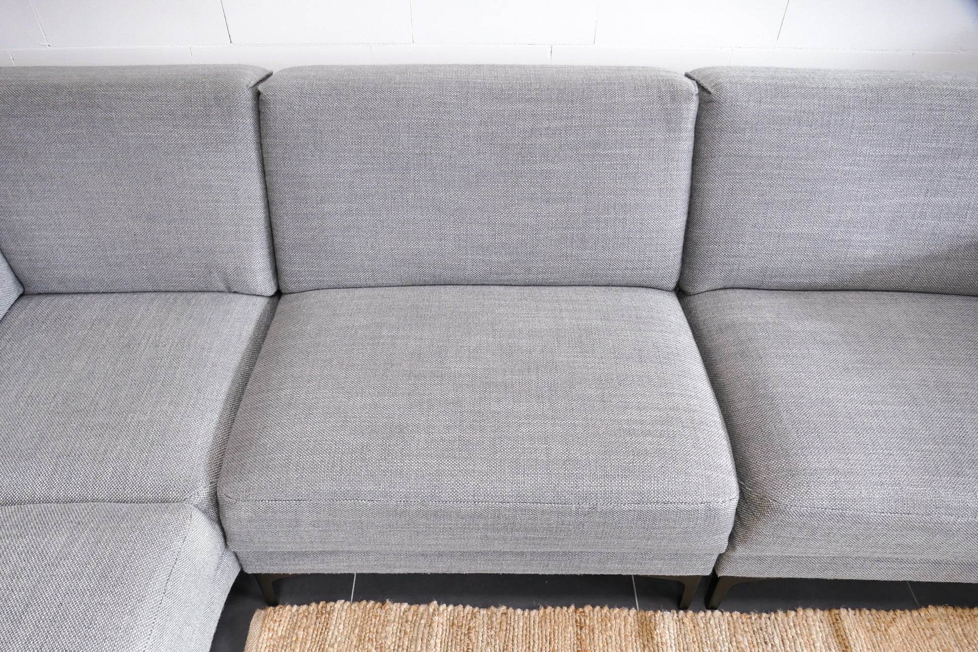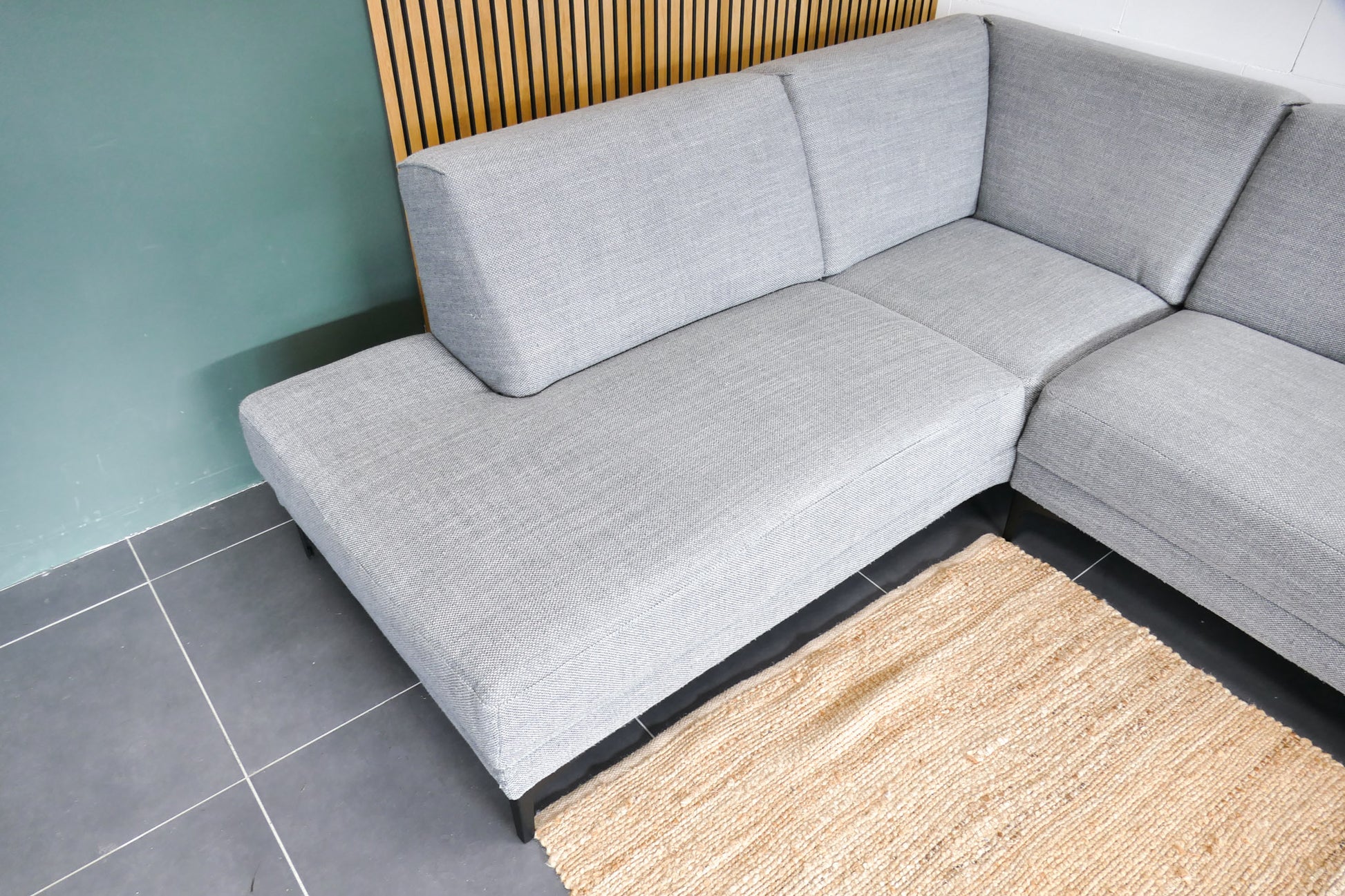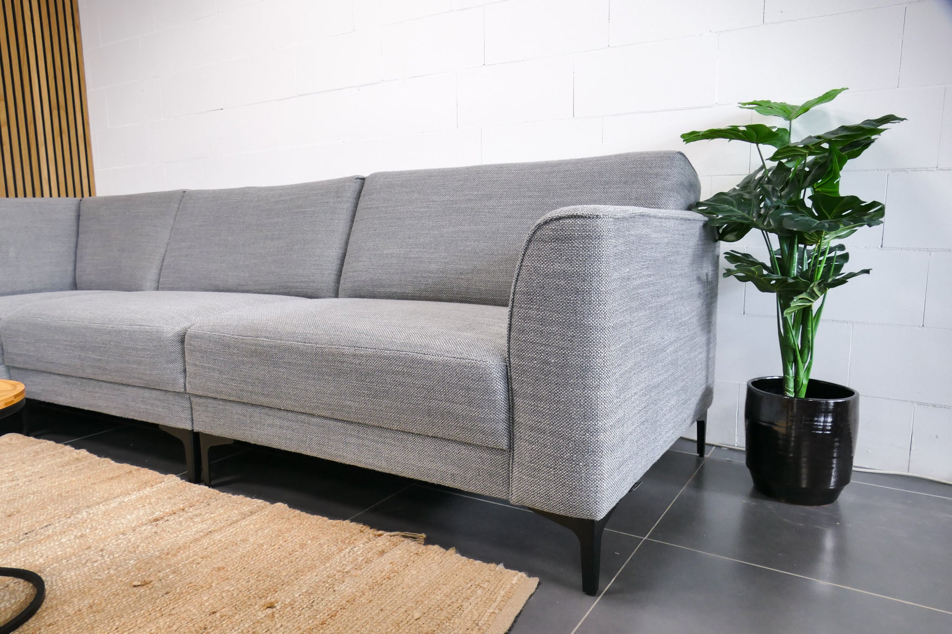 Grijze Montèl hoekbank met vaste rugkussens en een moderne industriële uitstraling. De bank biedt een comfortabele zit met kwalitatief koudschuim in de zitvlakken en verkeert in zeer goede staat zonder opvallende gebruikssporen.