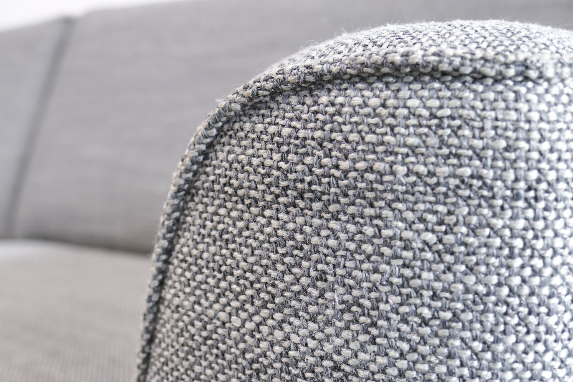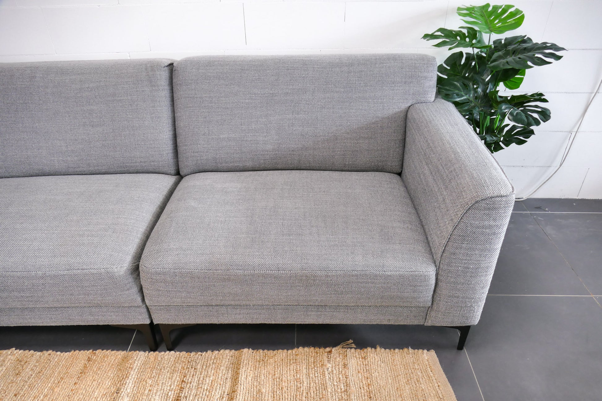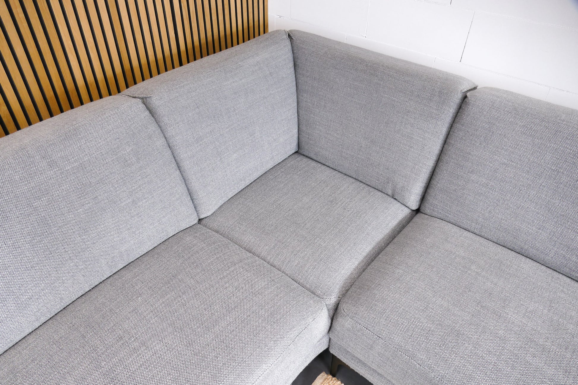 Grijze Montèl hoekbank met vaste rugkussens en een moderne industriële uitstraling. De bank biedt een comfortabele zit met kwalitatief koudschuim in de zitvlakken en verkeert in zeer goede staat zonder opvallende gebruikssporen.
