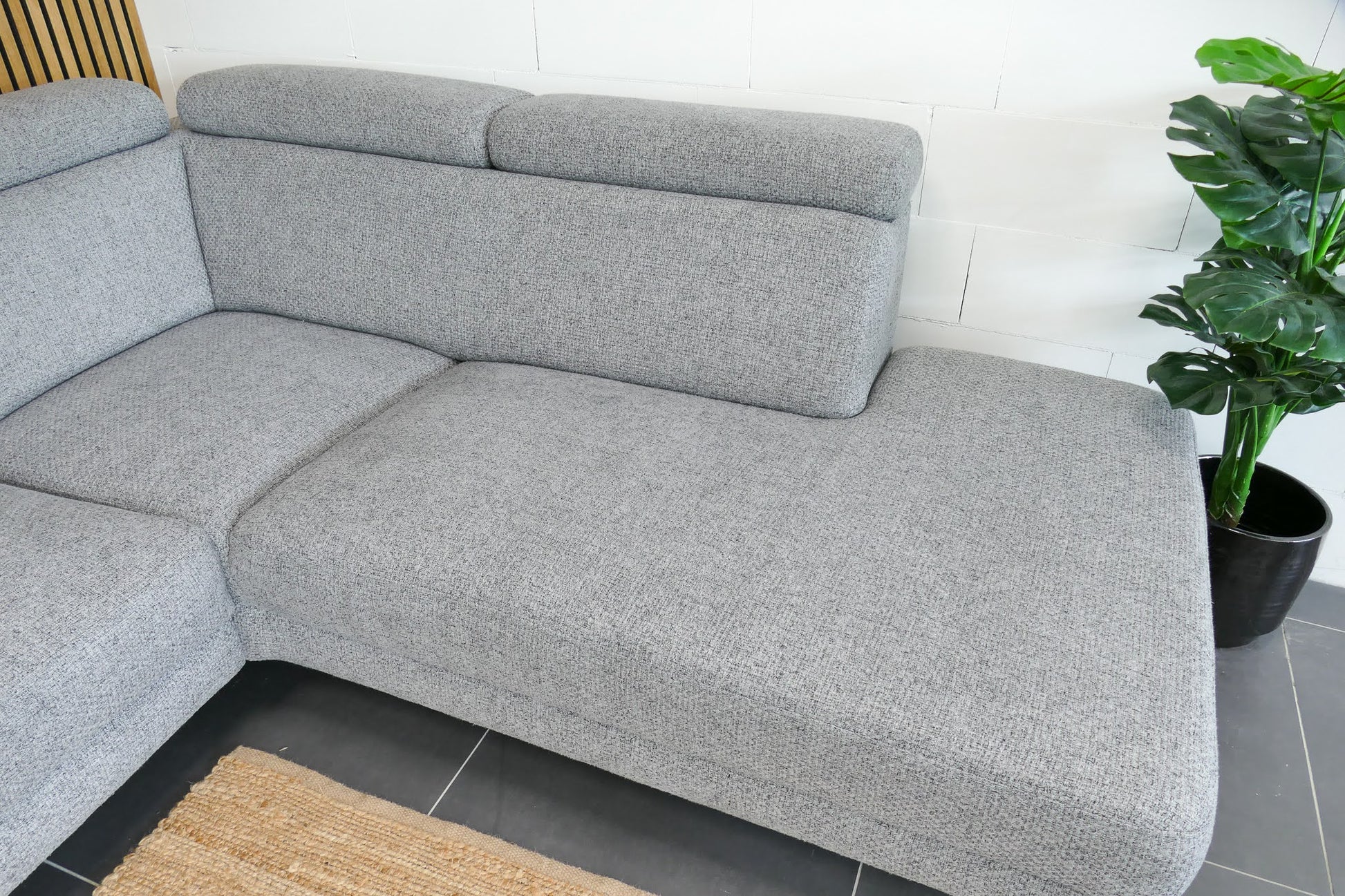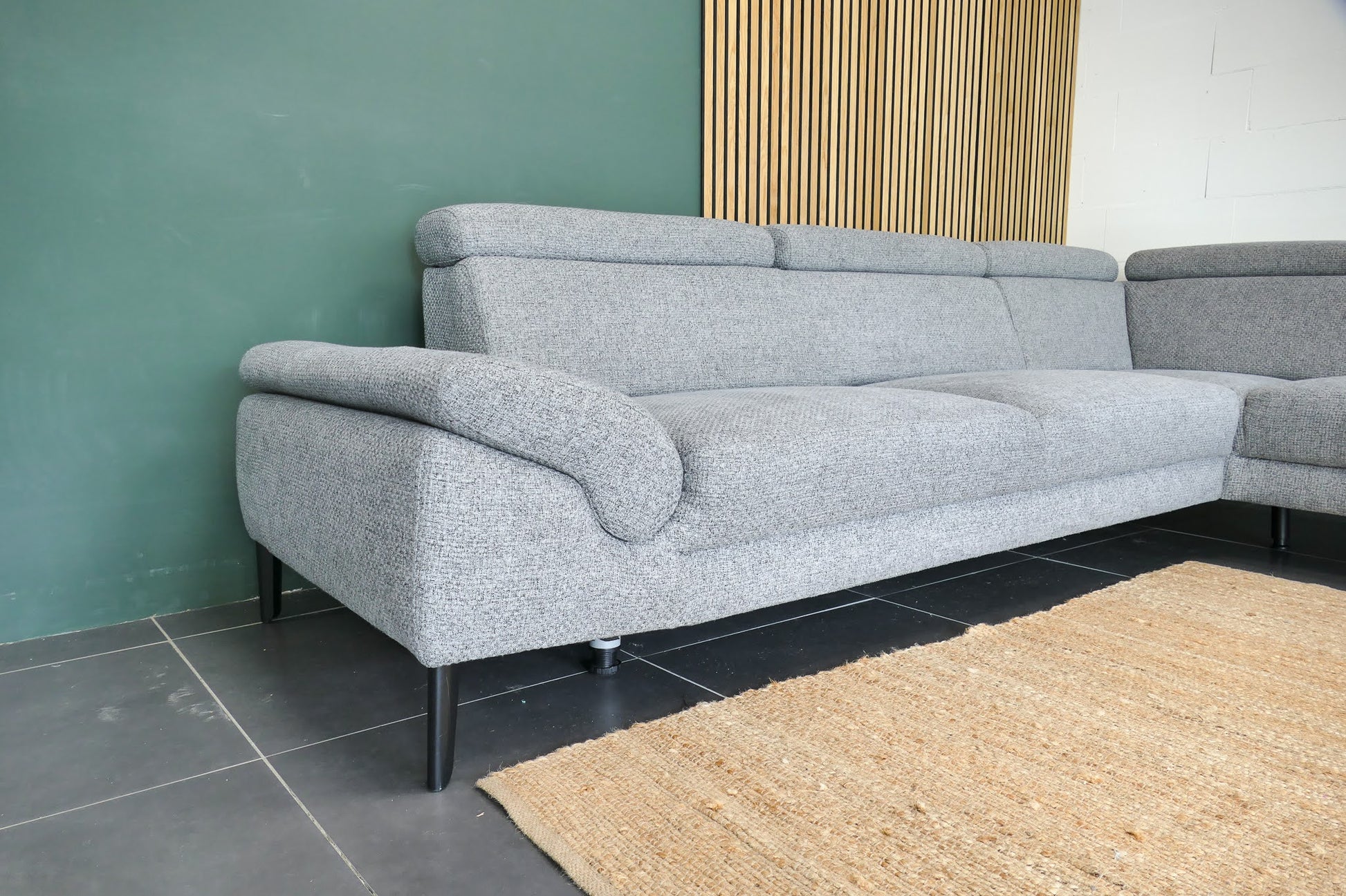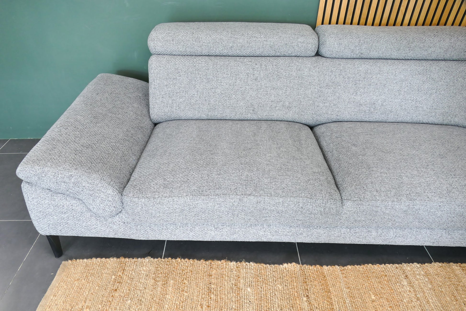 Stijlvolle Montèl Modena in grijs met verstelbare armleuning en rug-/hoofdsteunen. Dit model combineert modern design met praktisch comfort. De bank is stevig en zit prettig in een neutrale zithouding. In zeer goede staat, enkel een klein blauw puntje op de armleuning zichtbaar.