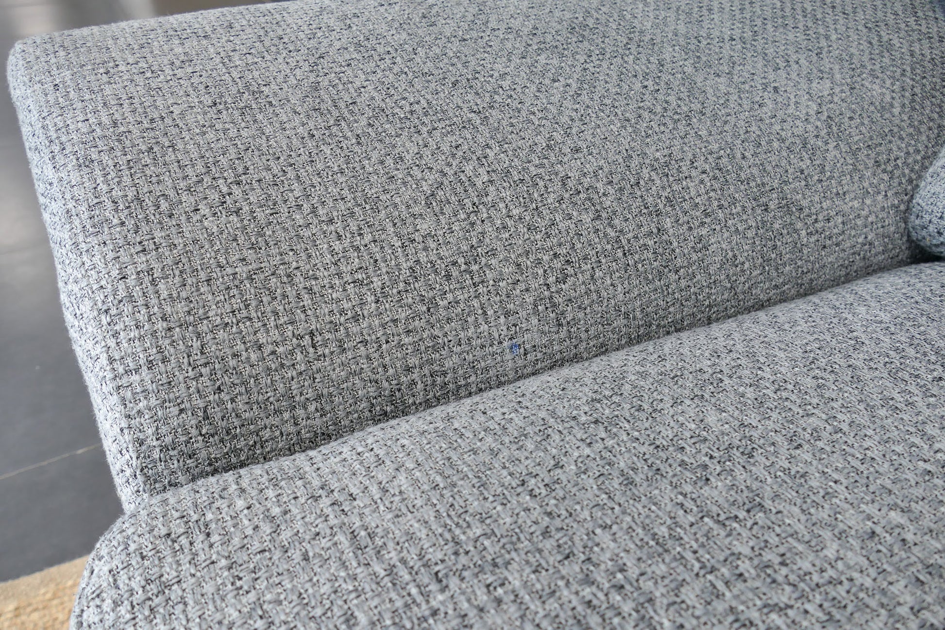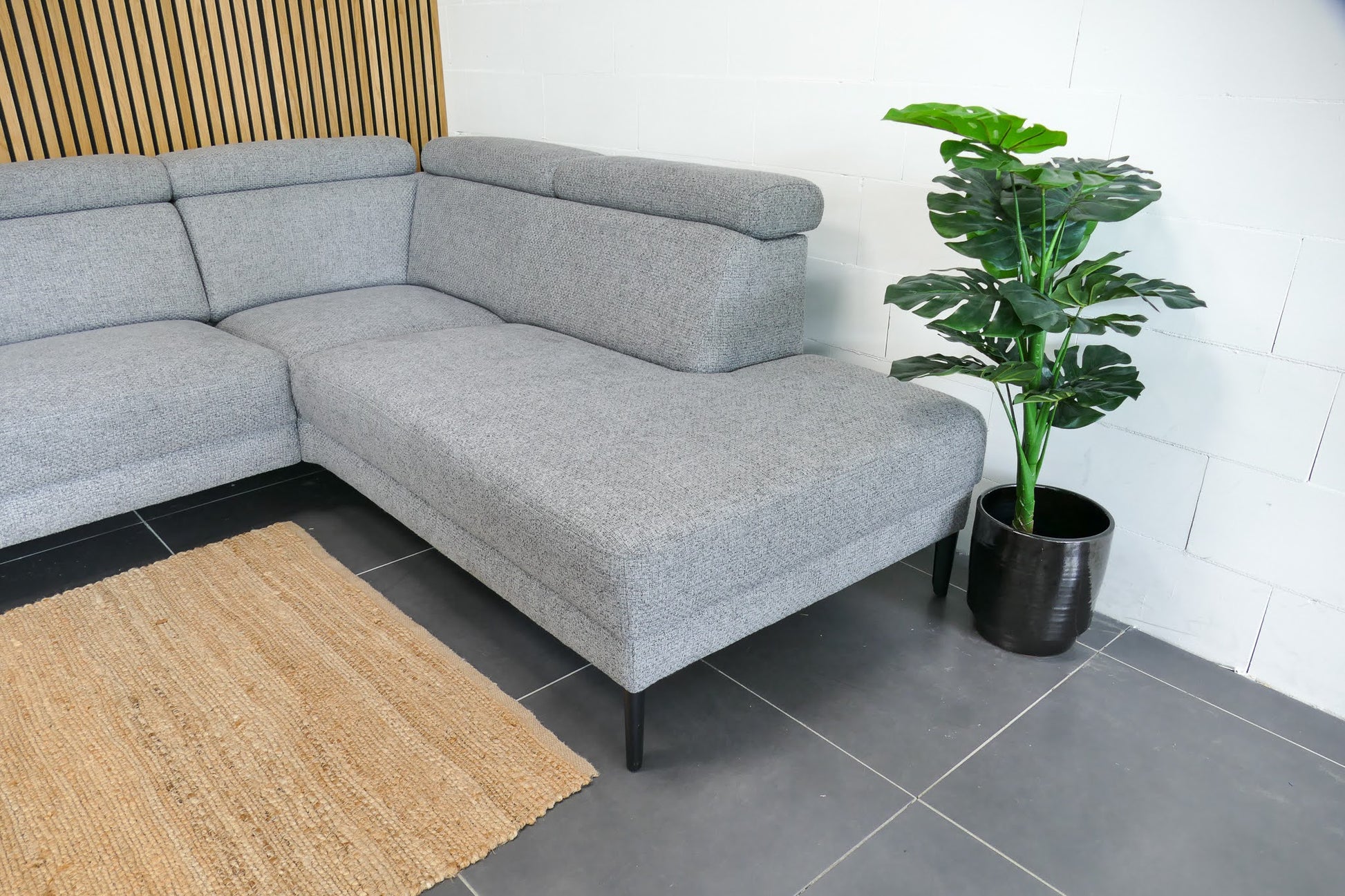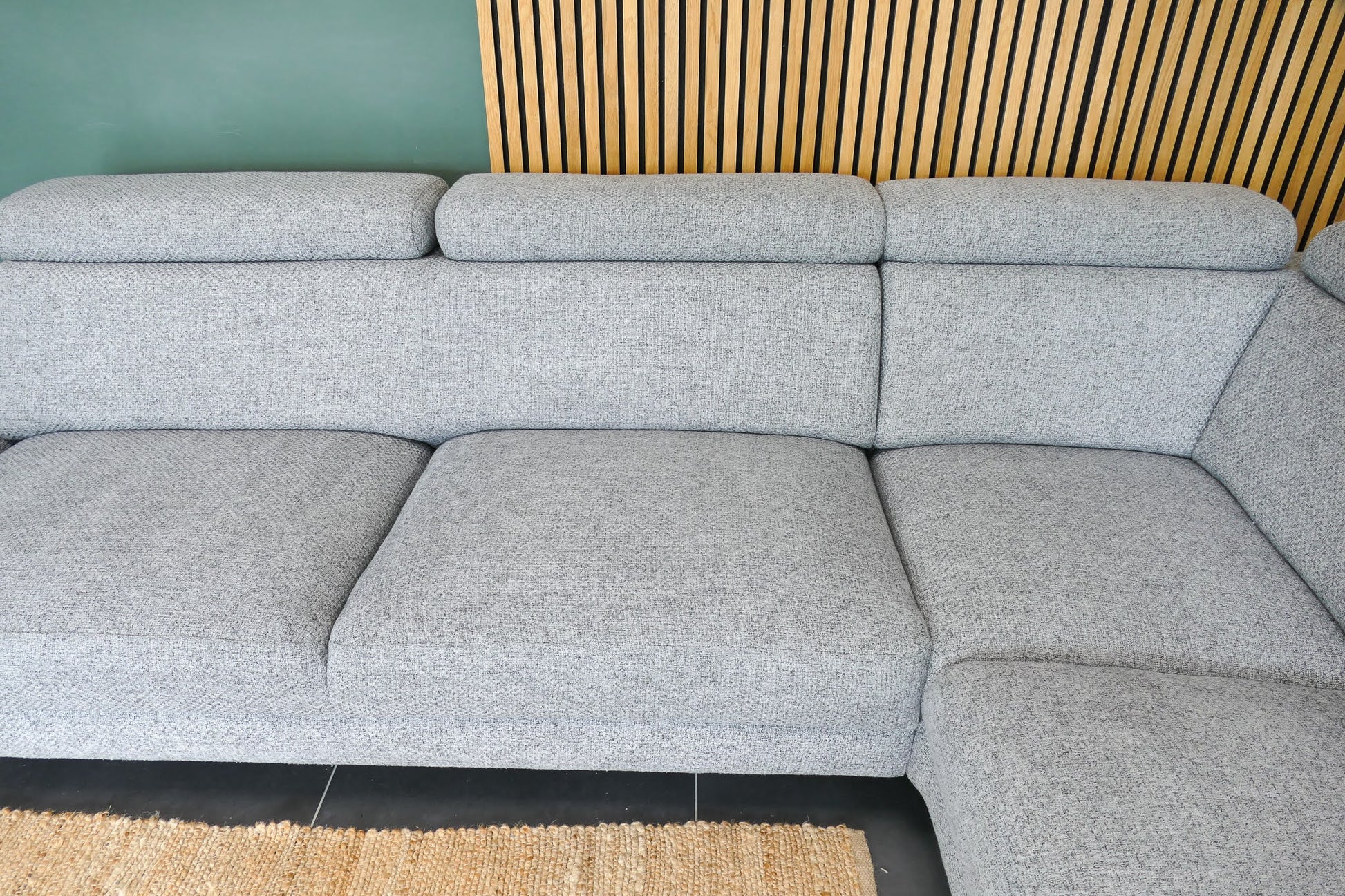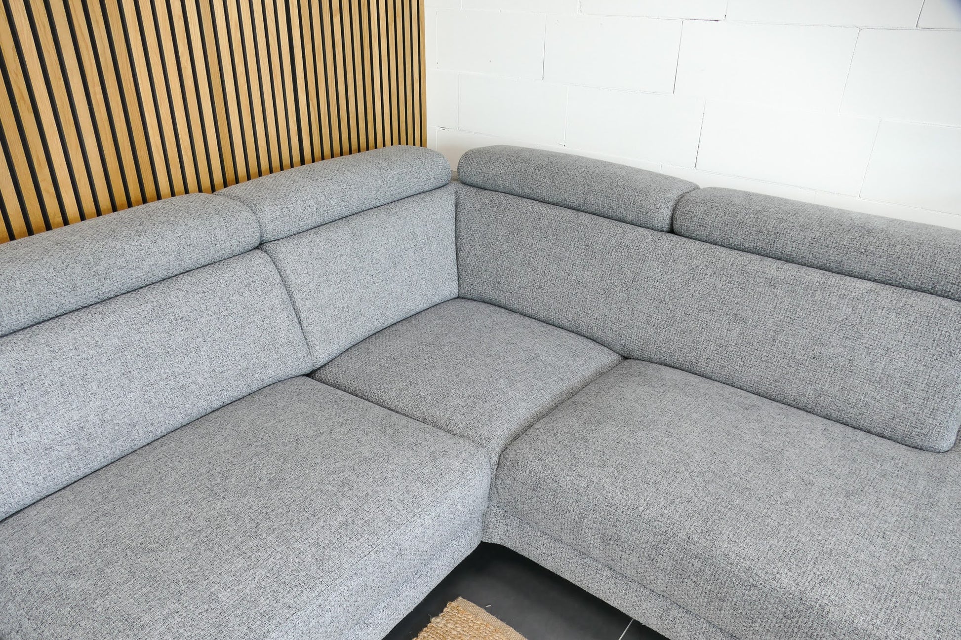 Stijlvolle Montèl Modena in grijs met verstelbare armleuning en rug-/hoofdsteunen. Dit model combineert modern design met praktisch comfort. De bank is stevig en zit prettig in een neutrale zithouding. In zeer goede staat, enkel een klein blauw puntje op de armleuning zichtbaar.