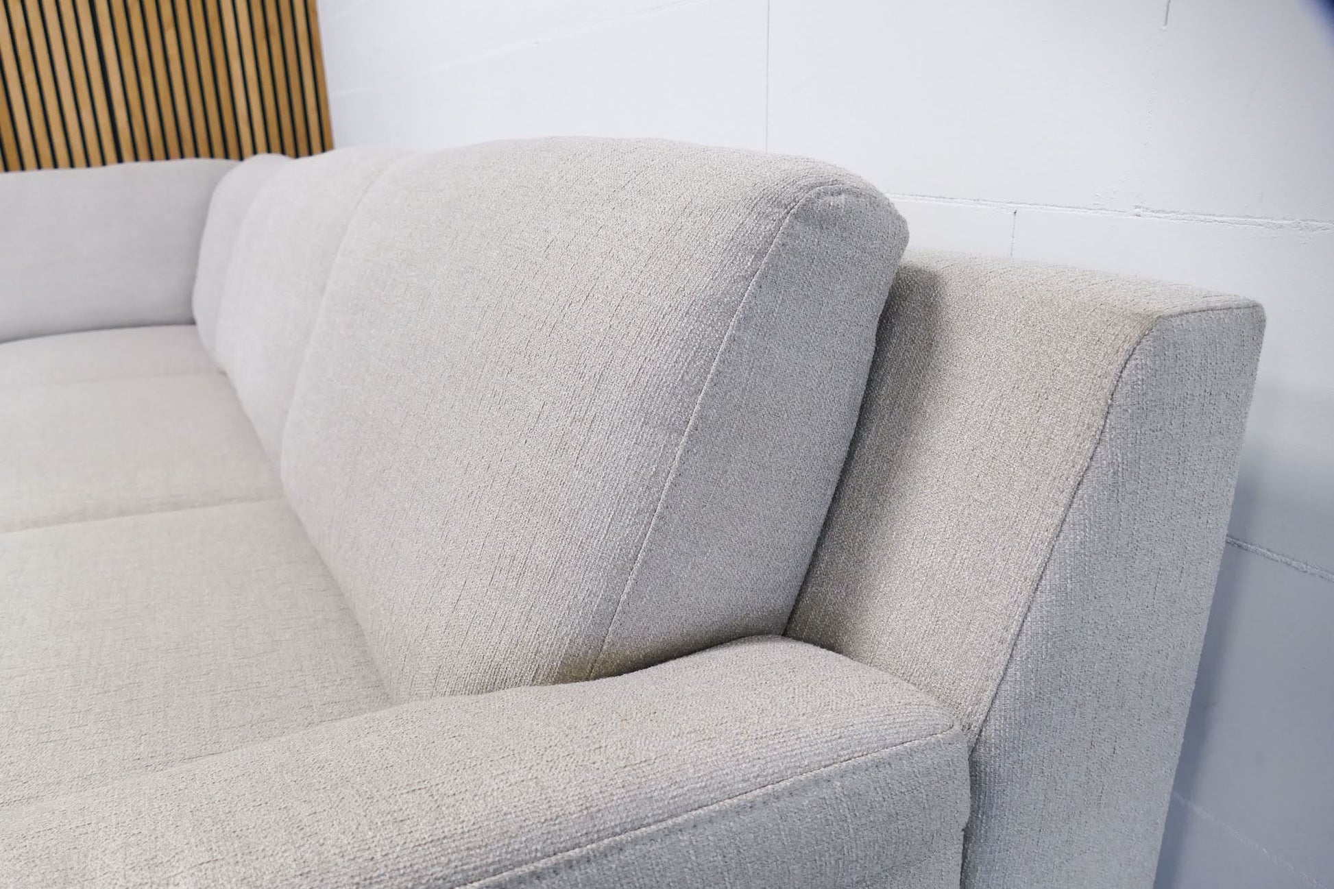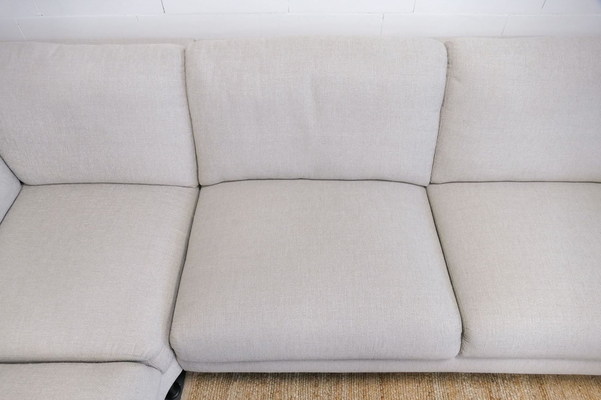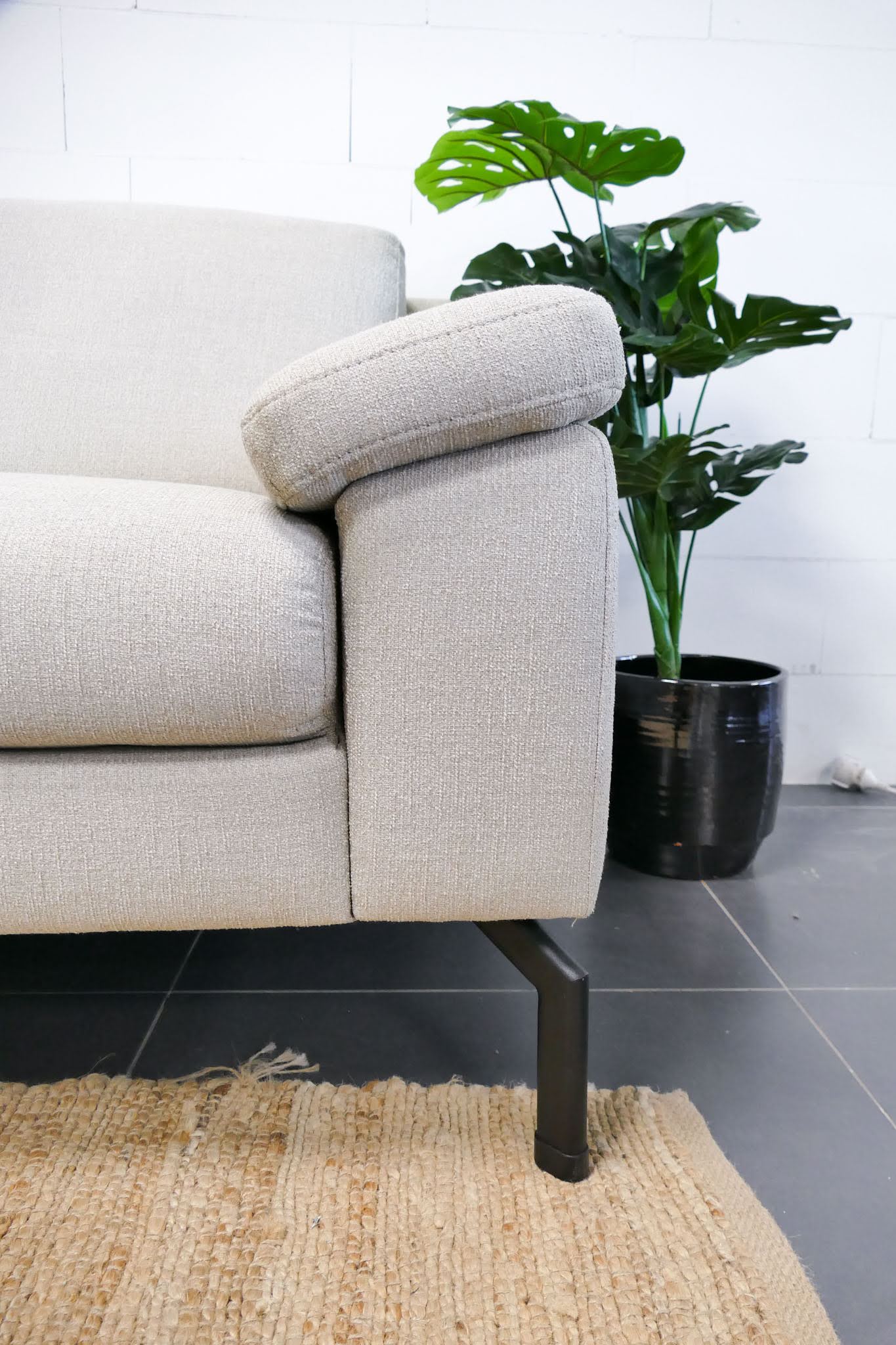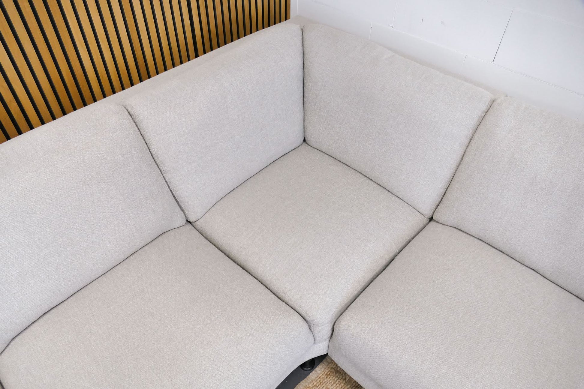 Montèl hoekbank in beige gemêleerde stof met vaste rugkussens en comfortabele zit. Strakke, industriële uitstraling met een rustige afwerking. Opgevuld voor langdurig zitcomfort.