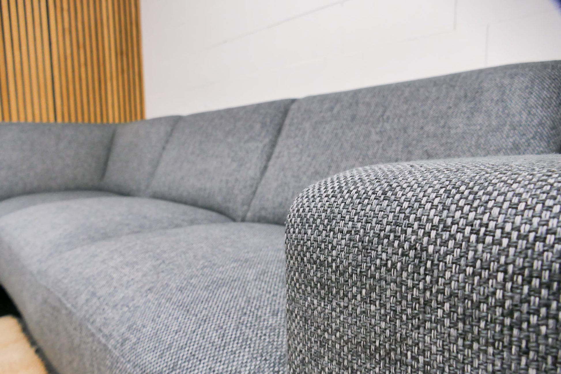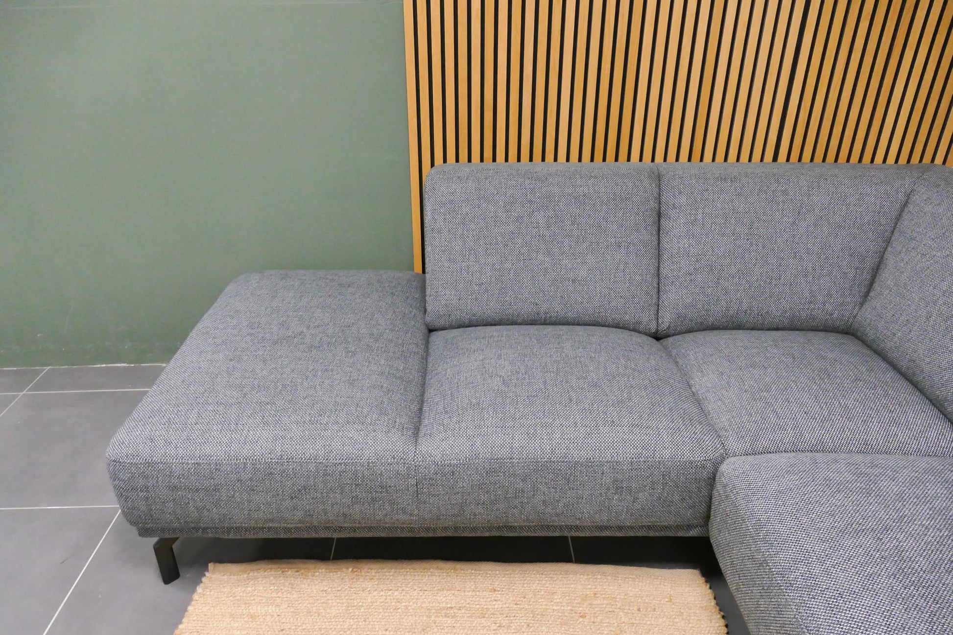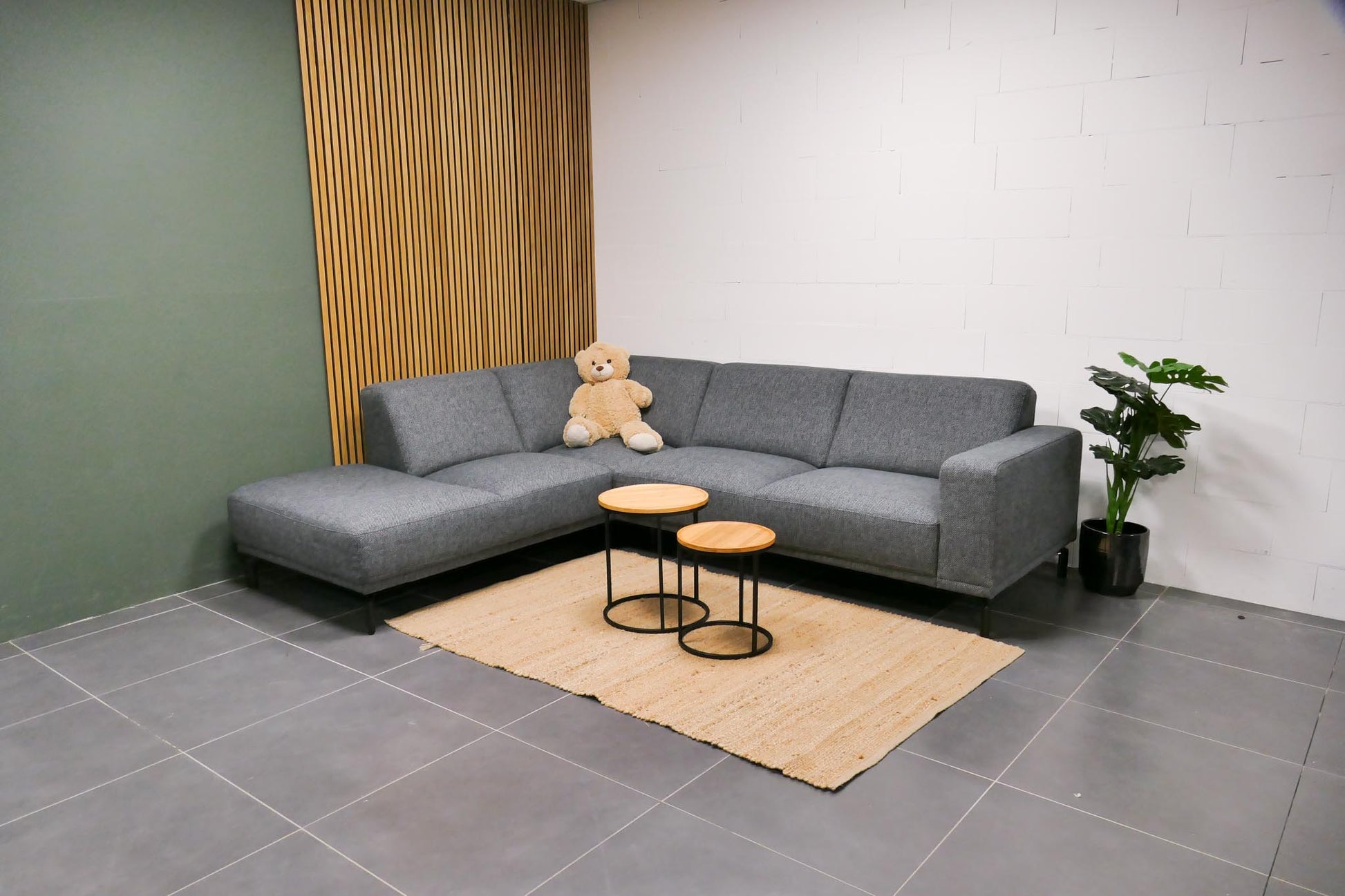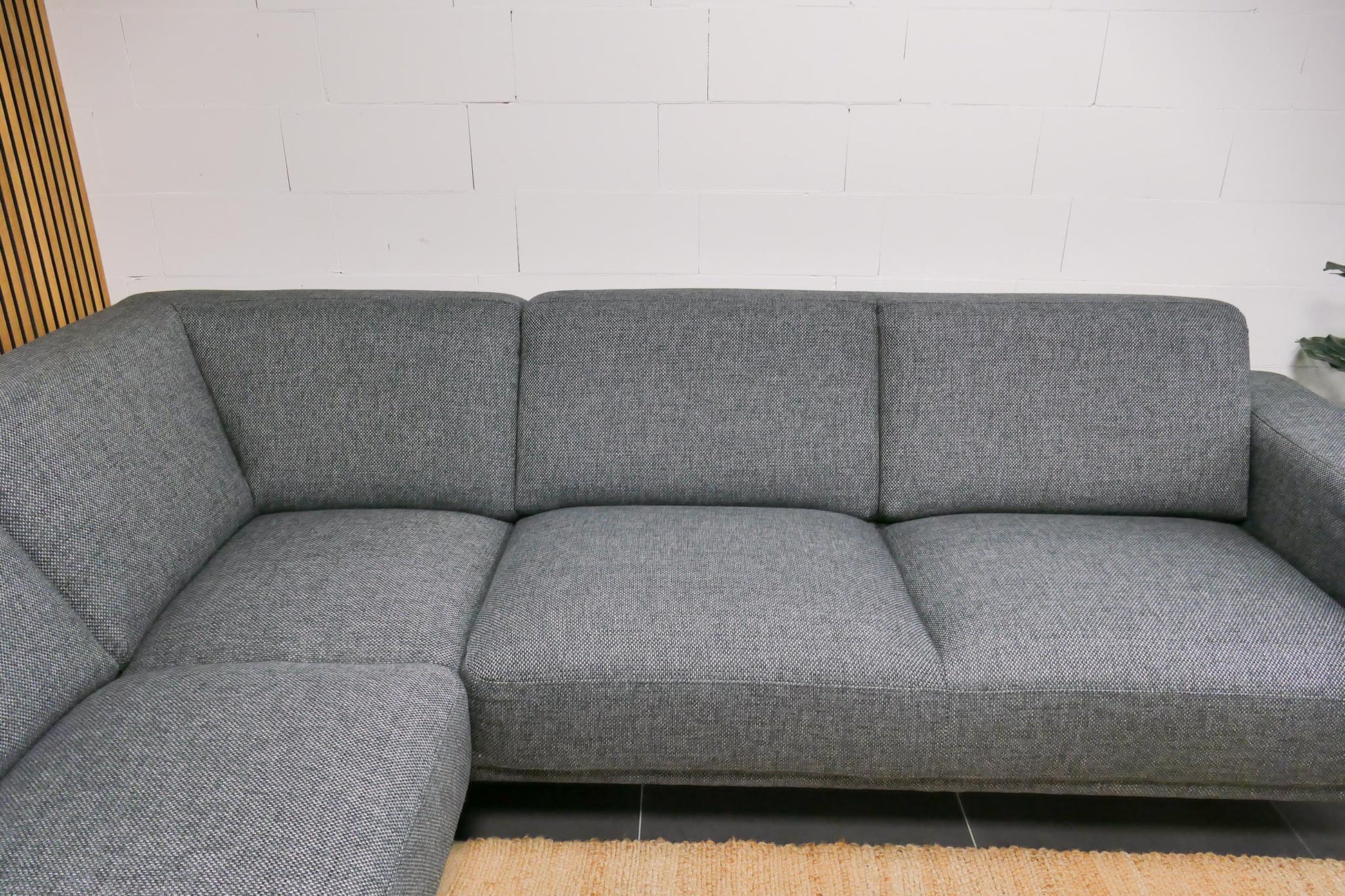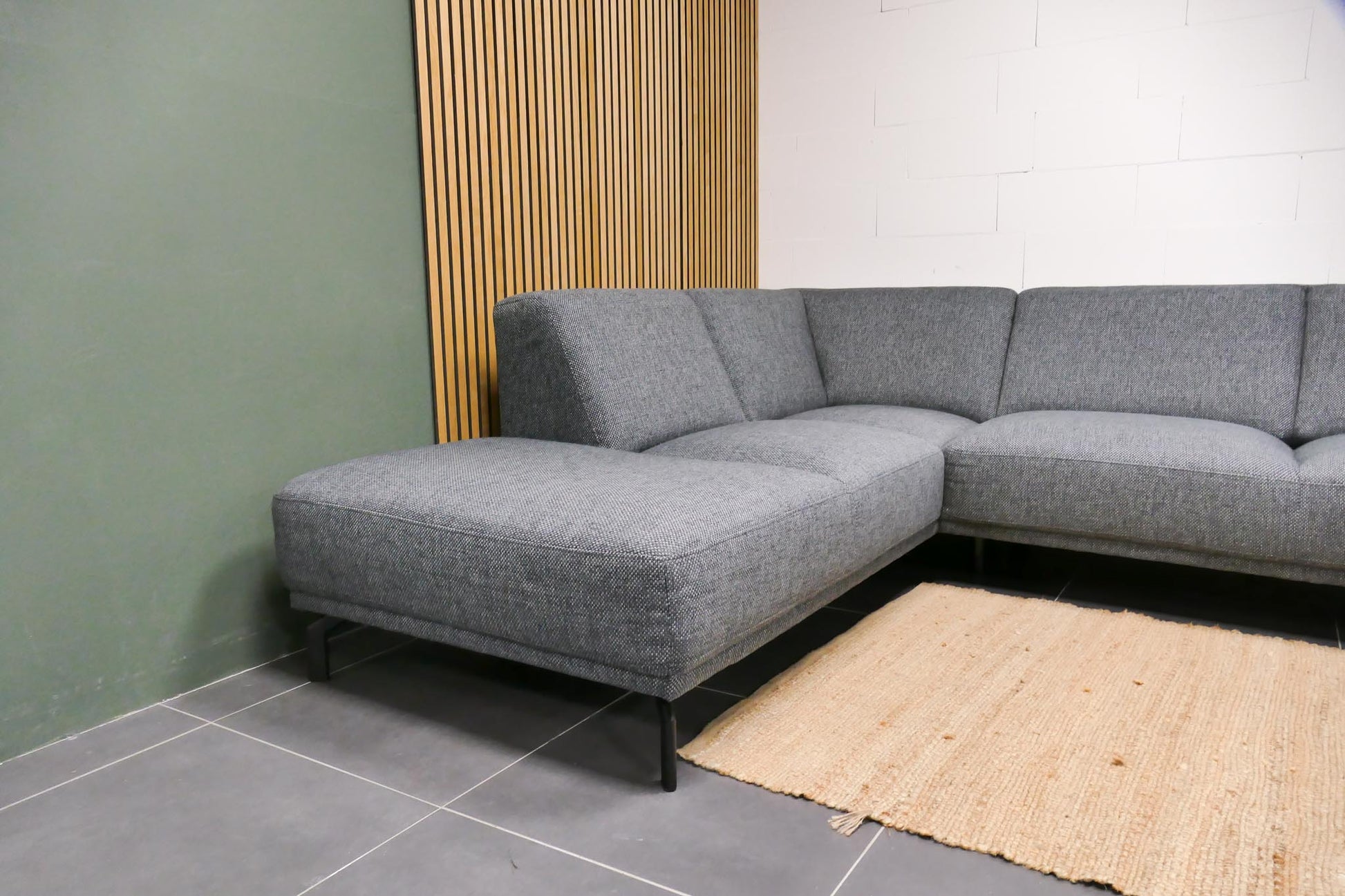 Montèl Viano hoekbank in antraciet gemêleerde stof met vaste zit- en rugkussens. Comfortabele zit met een tijdloos industrieel en modern ontwerp.