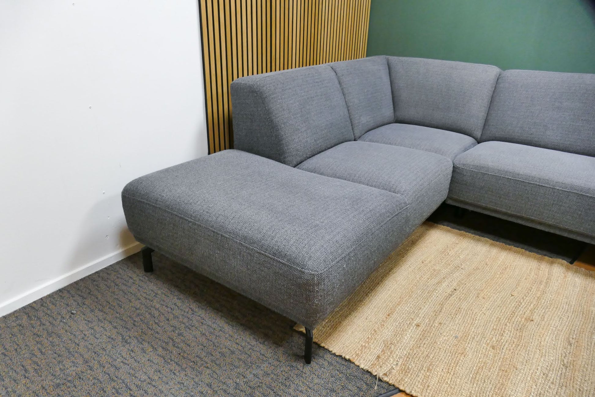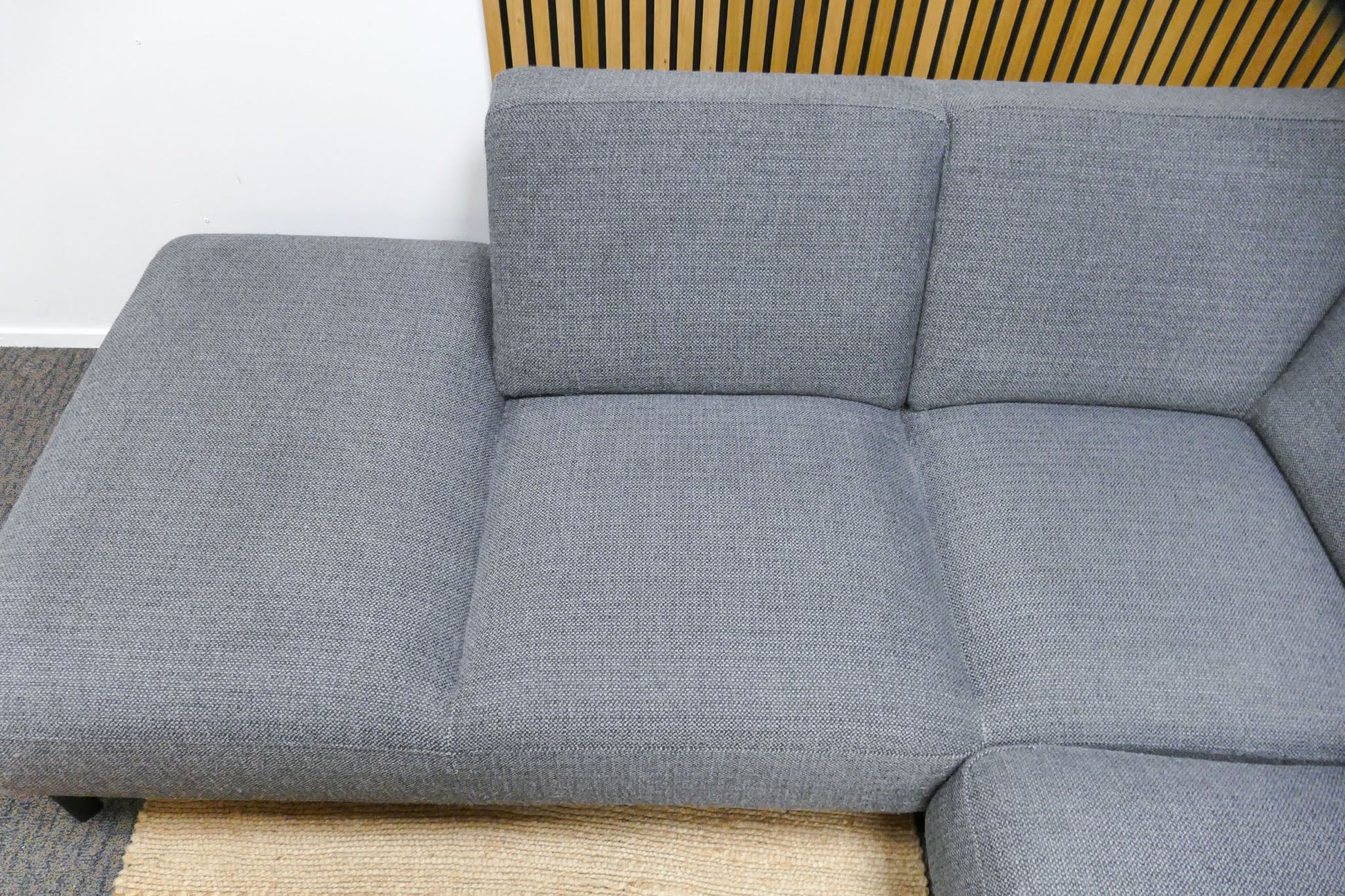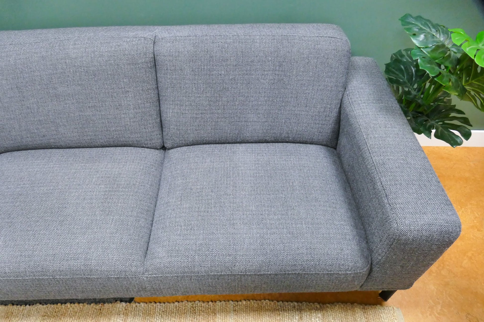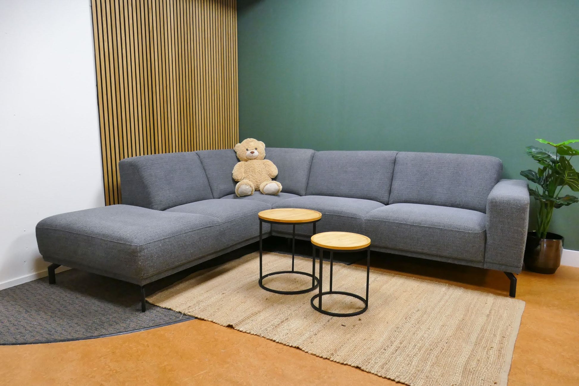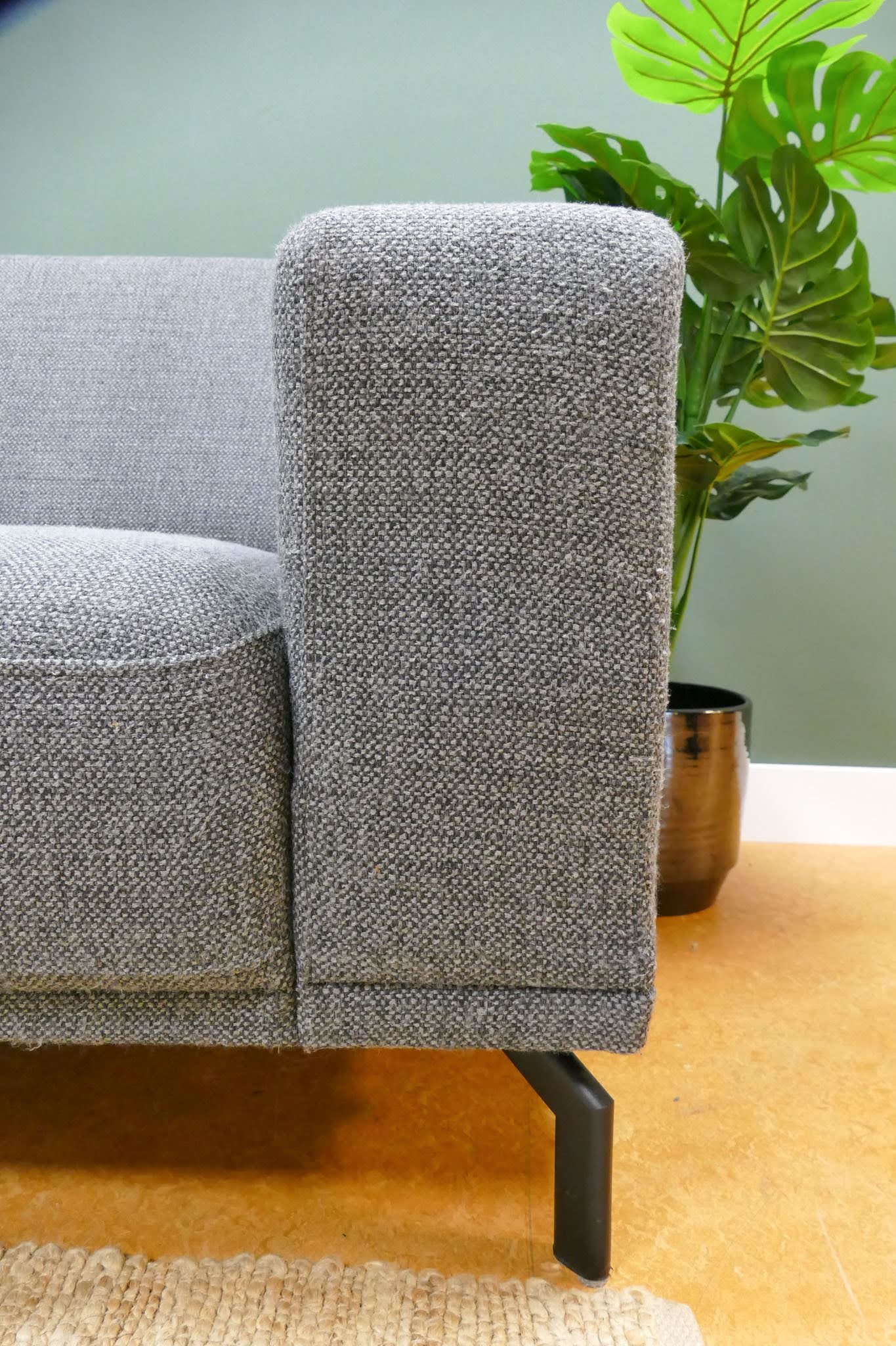 Montèl Viano hoekbank in donkergrijze gemêleerde stof met vaste rugkussens. Tijdloos model met comfortabele zit en praktische kleur. Opgevuld voor langdurig zitcomfort.