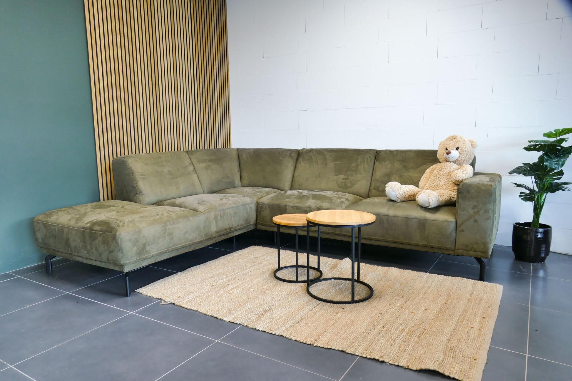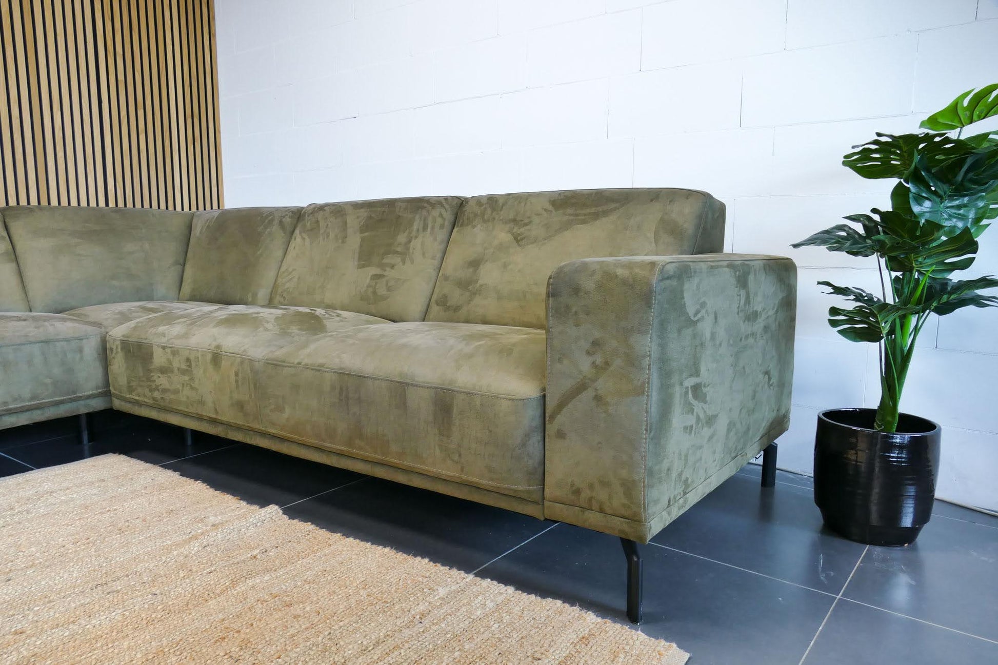 Olijfgroene Montèl Viano hoekbank in microvezel stof met vaste zit- en rugkussens. De bank is extra opgevuld voor langdurig ondersteunend zitcomfort. Verkeert in goede staat met lichte verkleuring op de rugleuning en wat slijtage op het zitvlak.