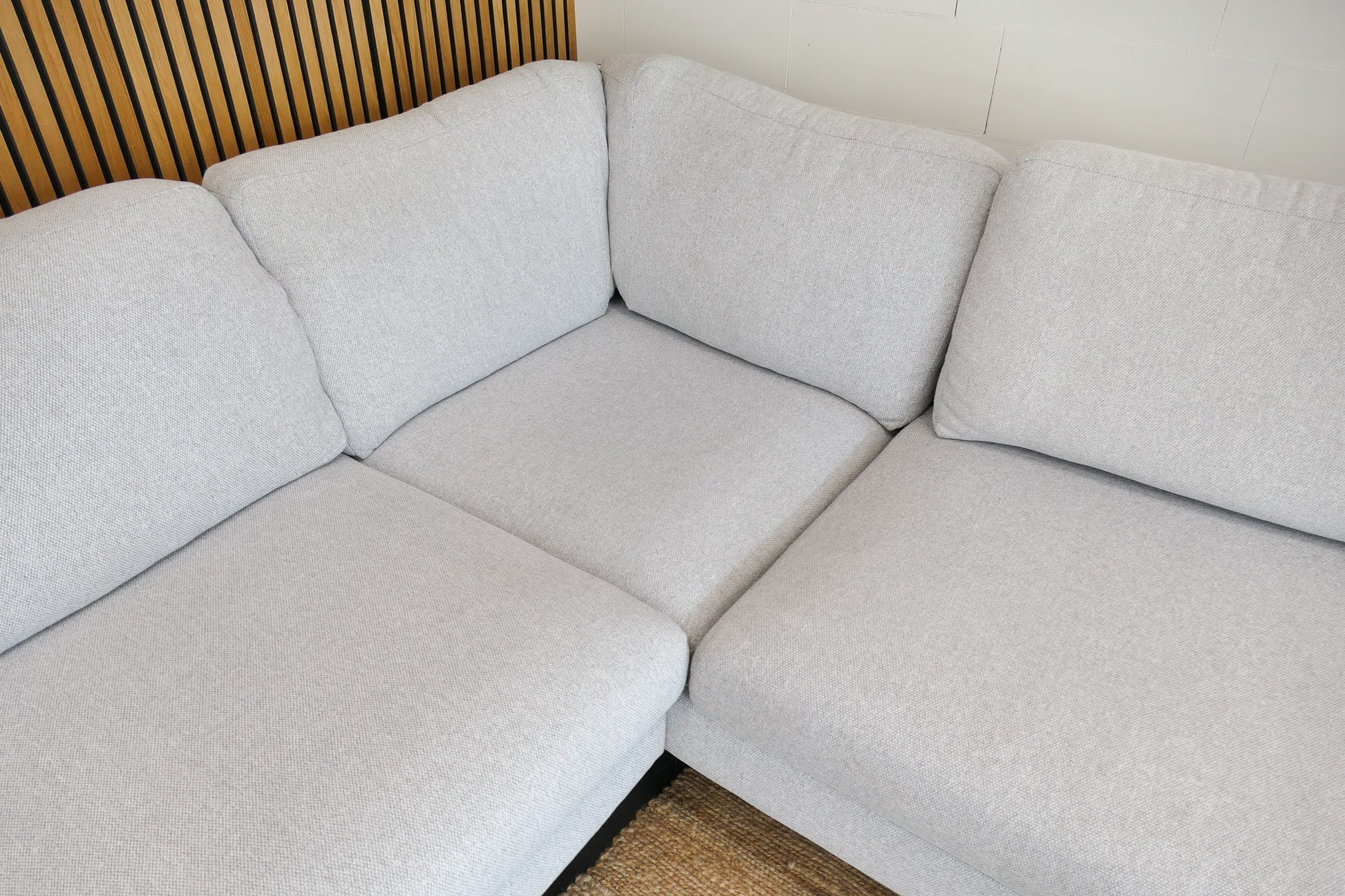 Royale lichtgrijze Montèl Dali U-bank met moderne industriële uitstraling. Voorzien van afneembare en wasbare zit- en rugkussens, ideaal voor onderhoud en langdurig gebruik. De bank verkeert in zeer goede staat met slechts minimale sporen van gebruik.