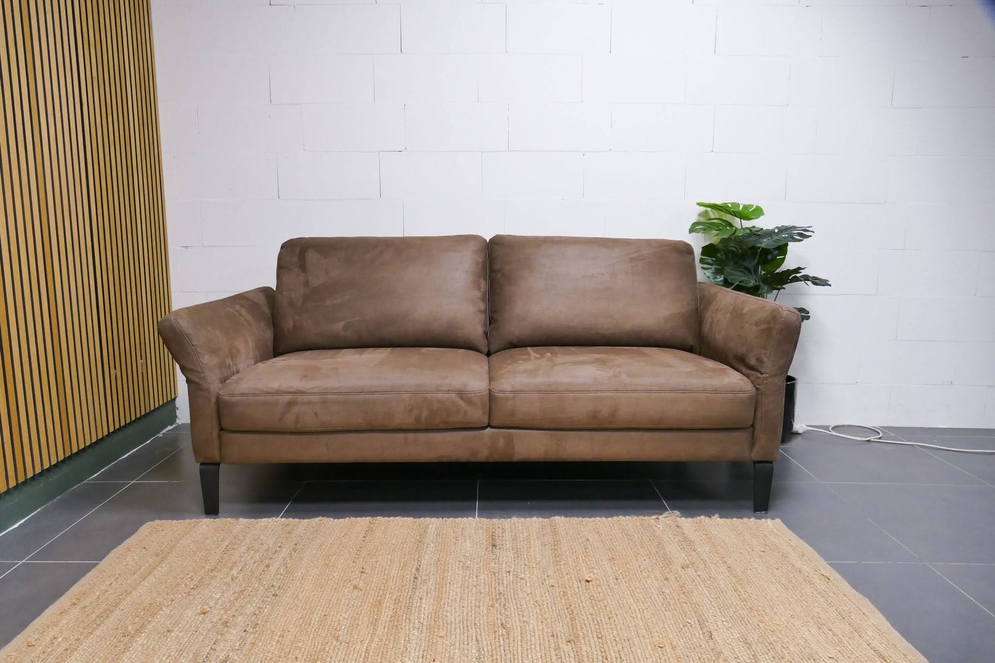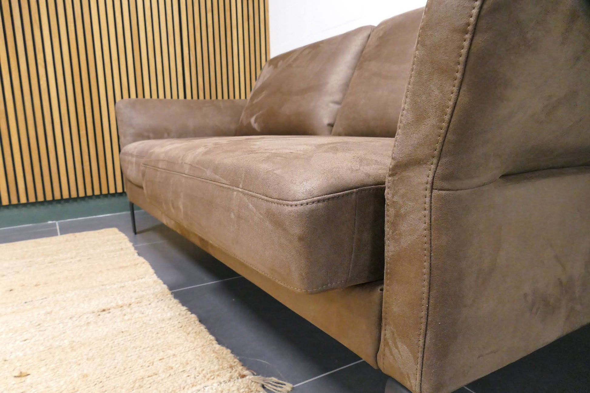 Bruine Prominent 2,5-zits bank met elektrisch verstelbaar zitgedeelte en vaste rugkussens. De bank is voorzien van zitvlakken van kwalitatief koudschuim en verkeert in zeer goede staat zonder opvallende gebruikssporen.
