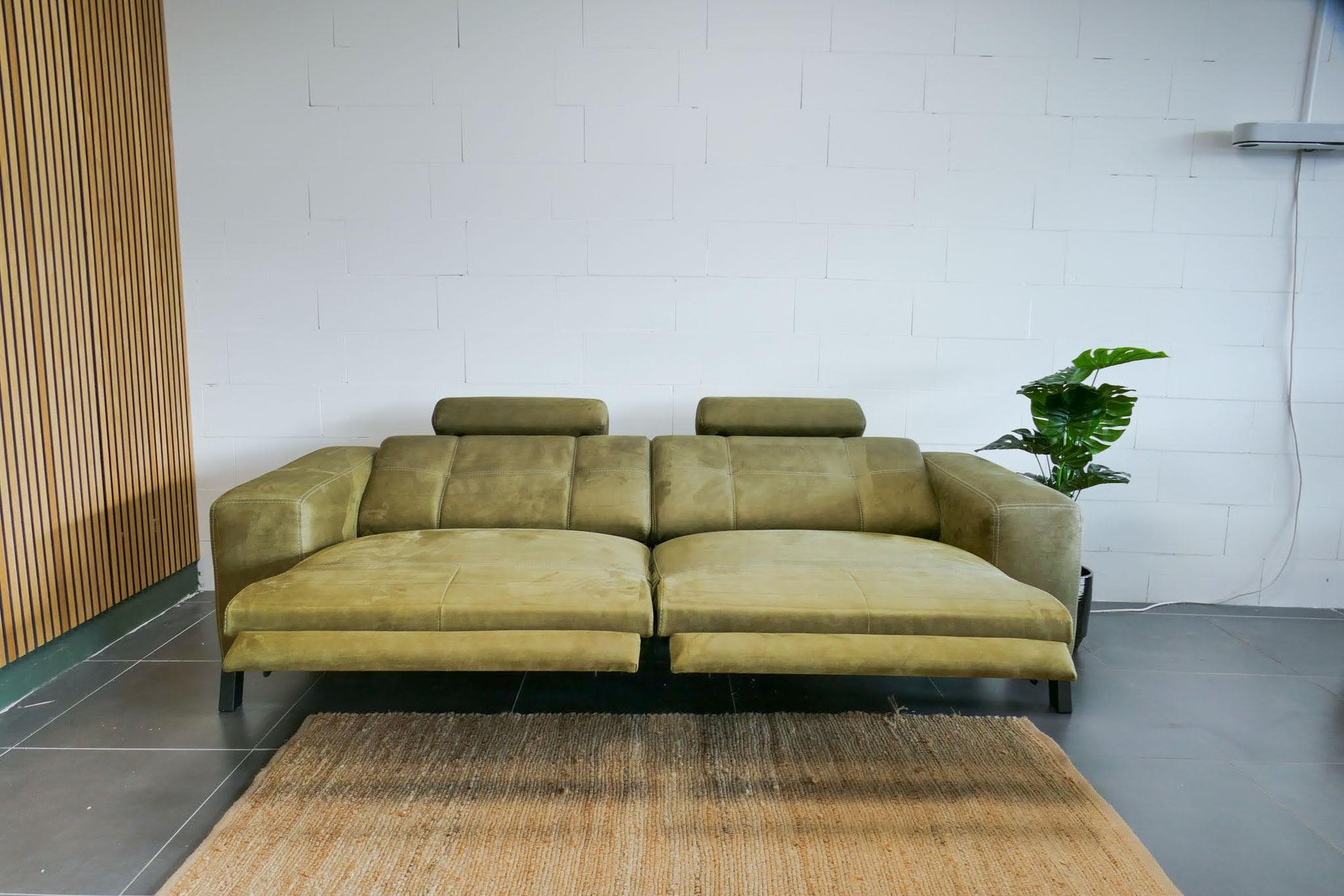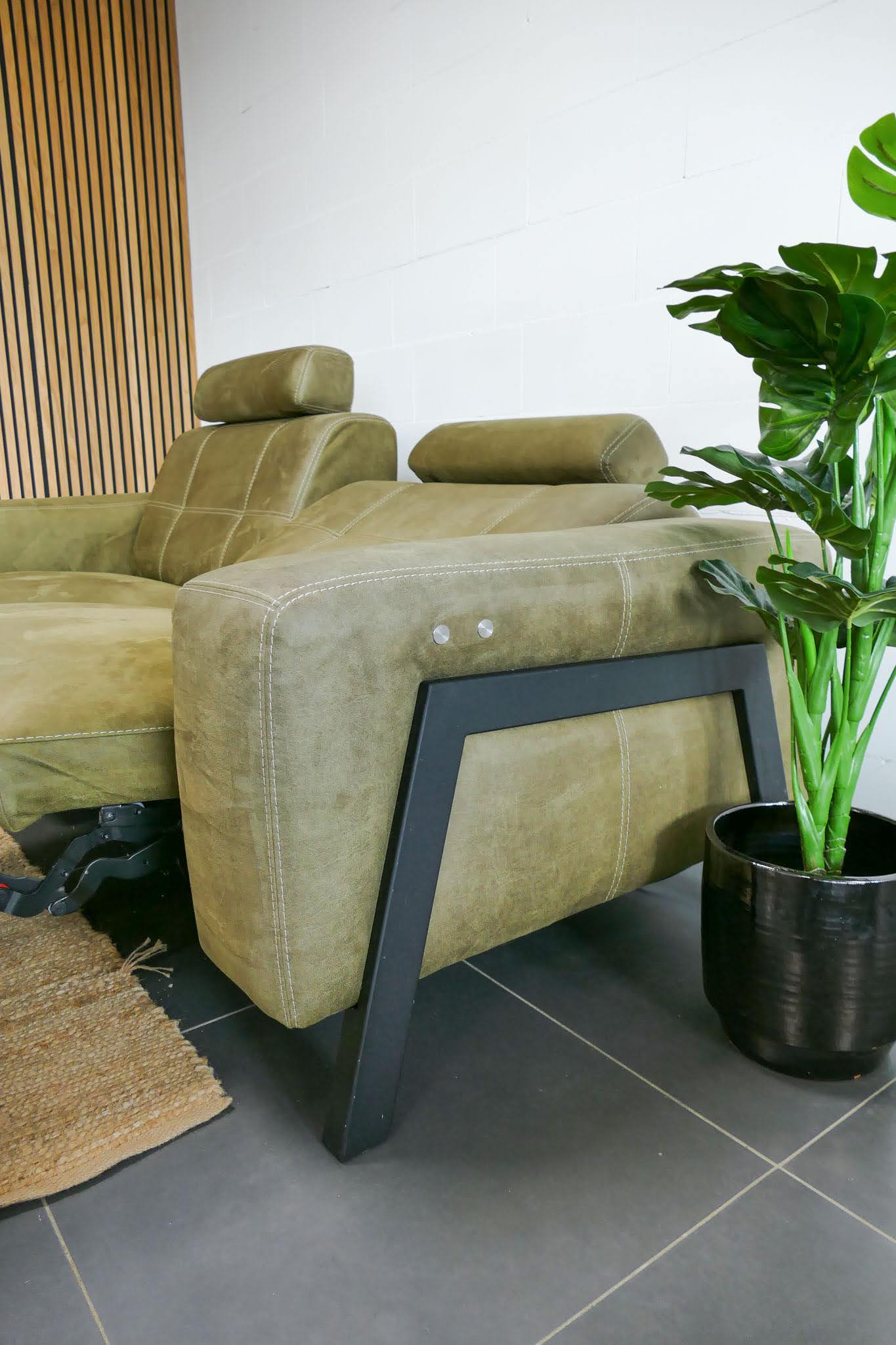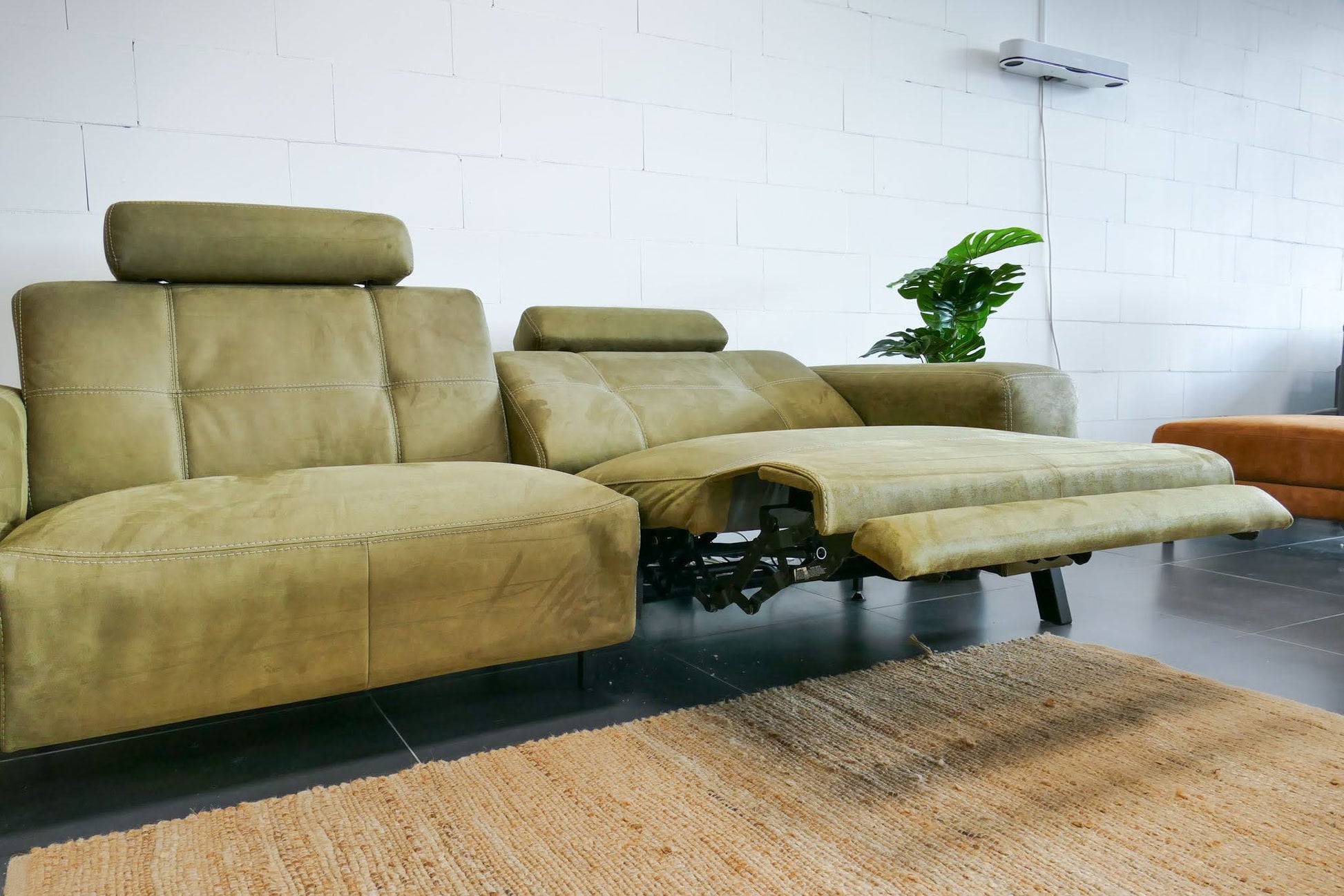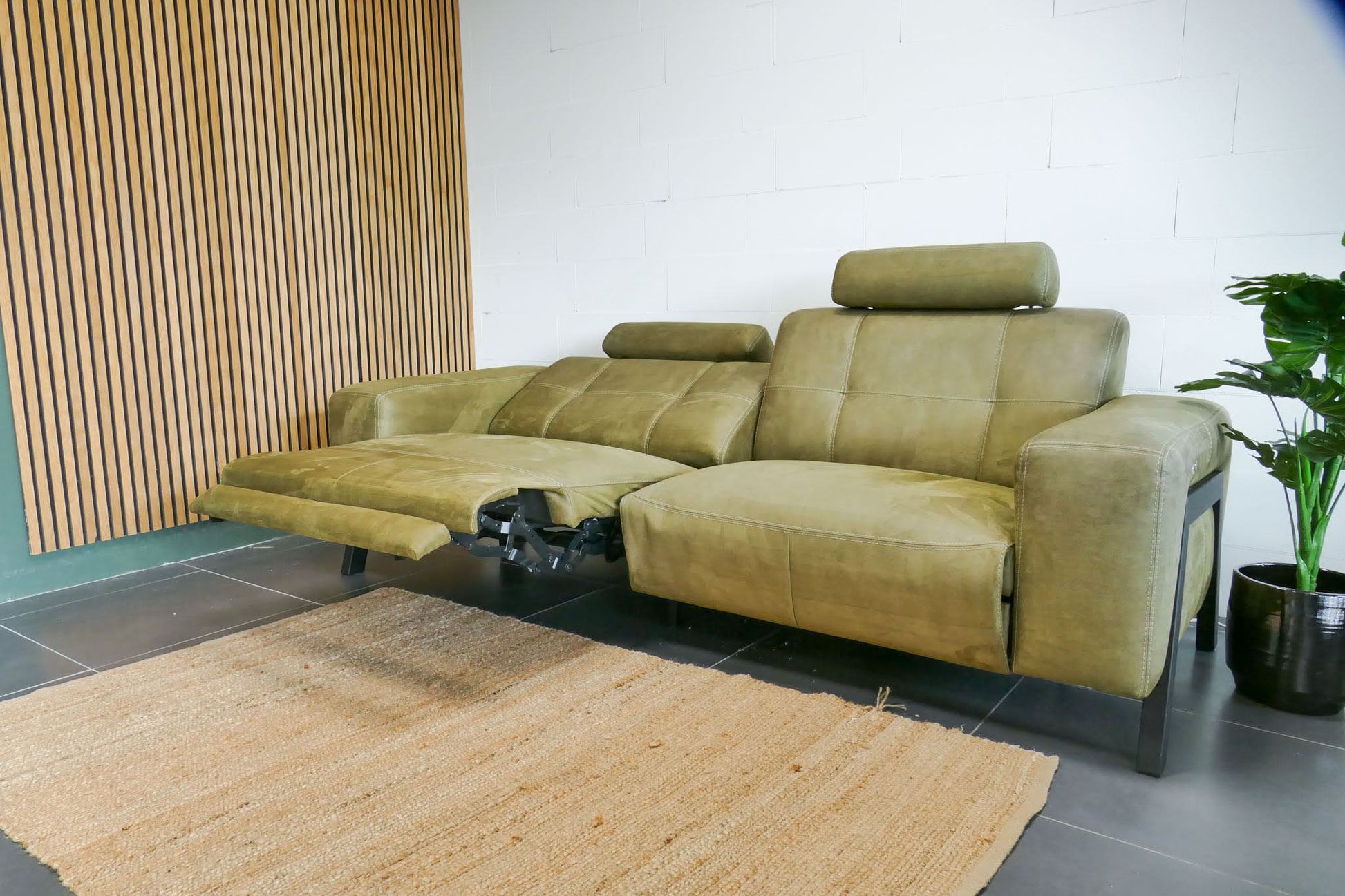 Groene elektrische 3-zits bank van De Bommel met comfortabele loungezit en een stevige afwerking. De bank is technisch in zeer goede staat.