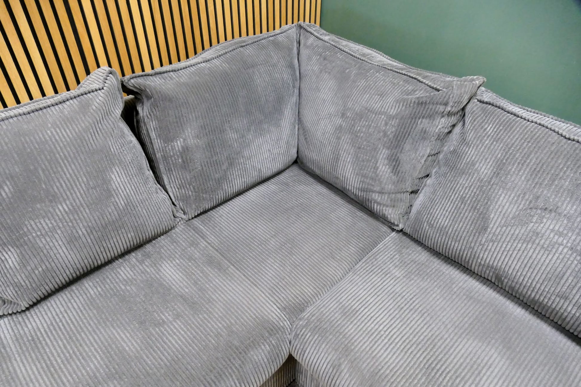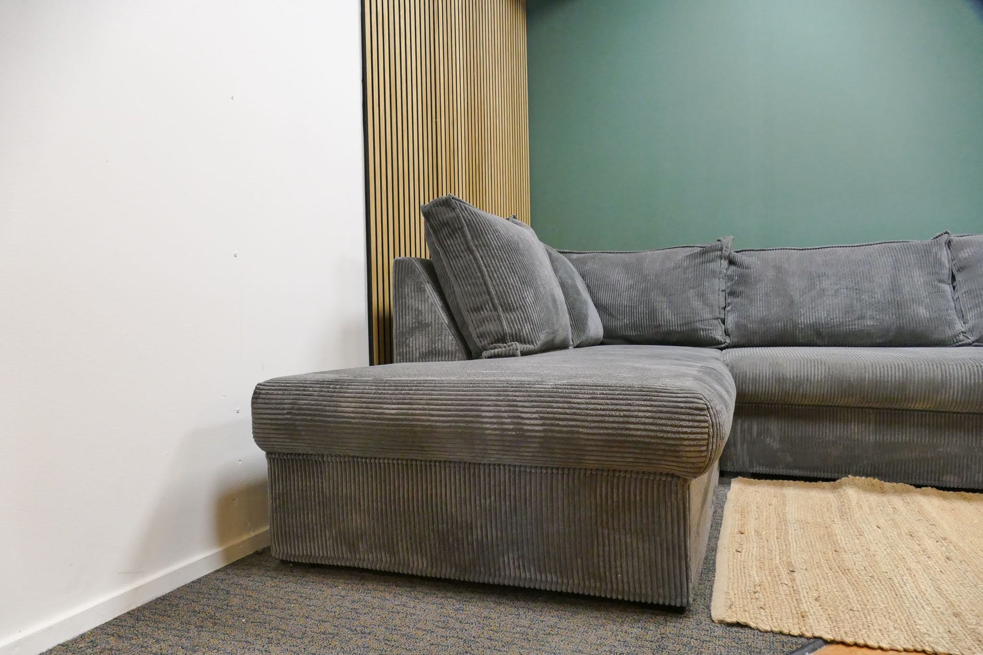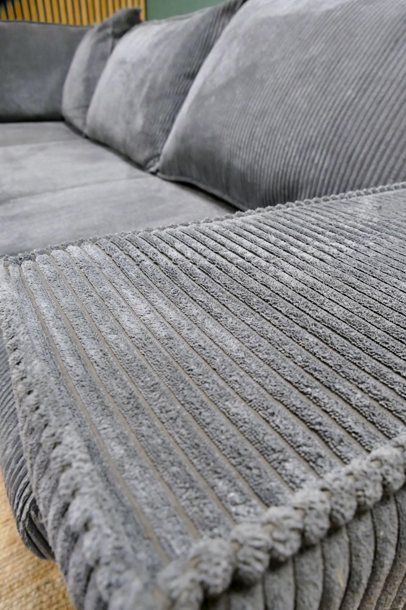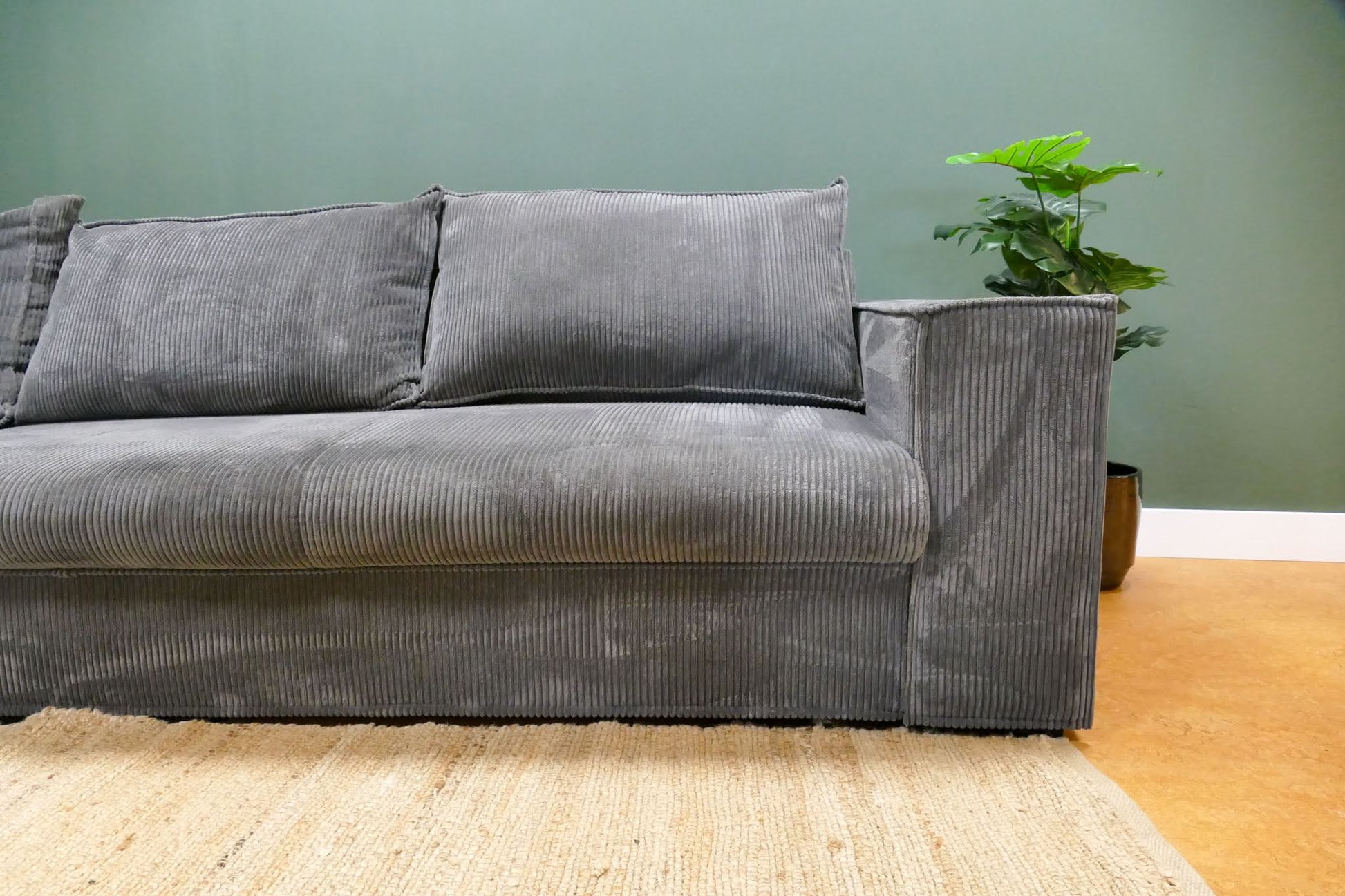 Hoekbank in grijze ribstof met afneembare rugkussens en vaste zitkussens. Comfortabele zit met zachte uitstraling door de populaire ribstof. Opgevuld voor langdurig zitcomfort.