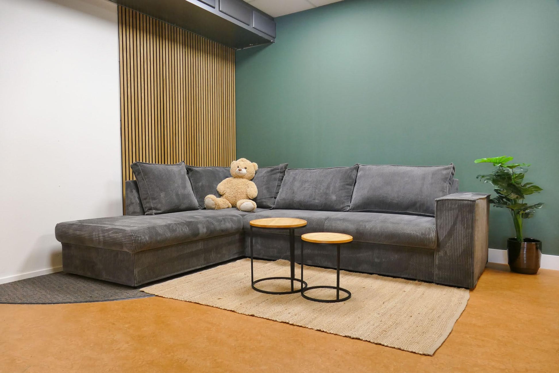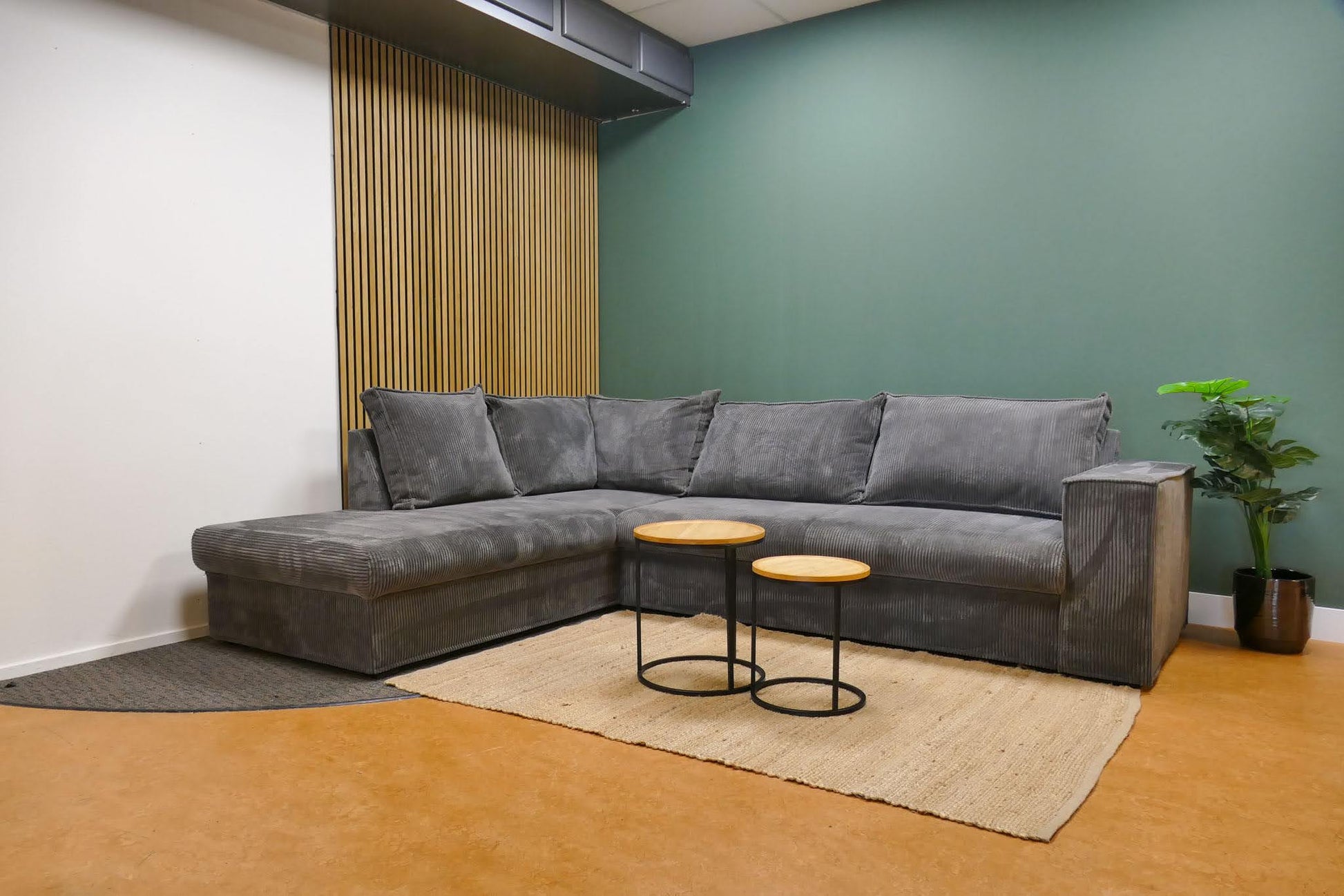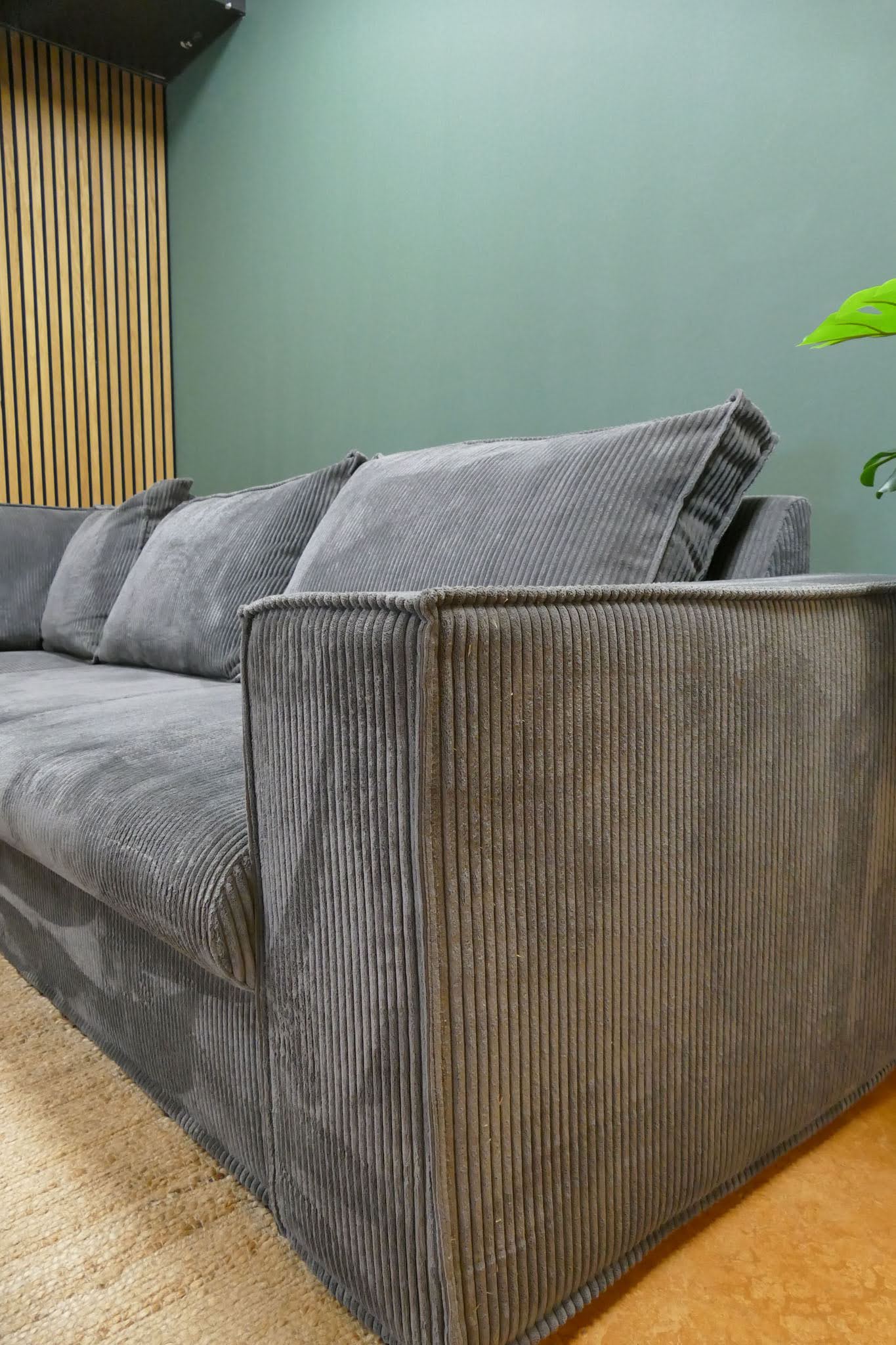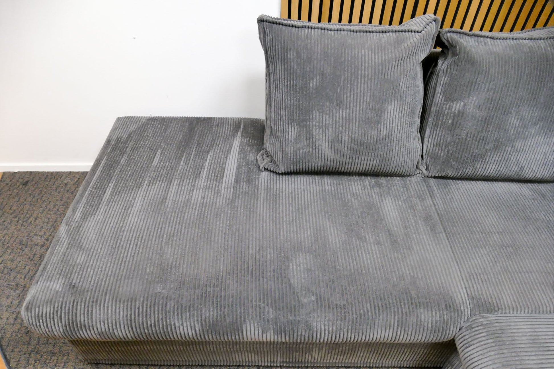 Hoekbank in grijze ribstof met afneembare rugkussens en vaste zitkussens. Comfortabele zit met zachte uitstraling door de populaire ribstof. Opgevuld voor langdurig zitcomfort.