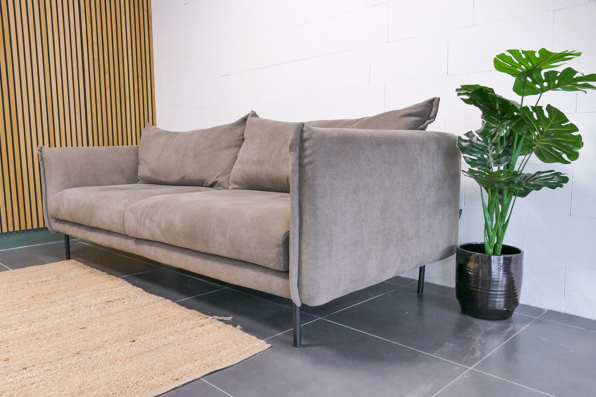 Stijlvolle 3-zits bank van Trendhopper in een warme bruin/taupe kleur. Voorzien van afneembare rugkussens en uitgevoerd in een stevige uni-stof met organische vormen. De bank verkeert in uitstekende staat, vergelijkbaar met showroomkwaliteit, en biedt een comfortabele loungezit.