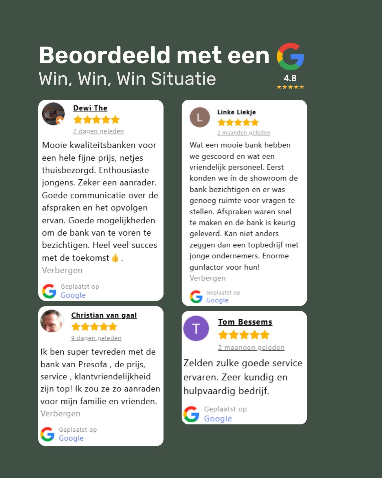• Retourkosten (het ophalen van de bank) zijn voor de klant, gelijk aan de bezorgkosten van de heenzending. Als je ervoor kiest om de bank weer door onze bezorgservice op te halen krijg je dus het aankoopbedrag exclusief bezorgkosten terug.