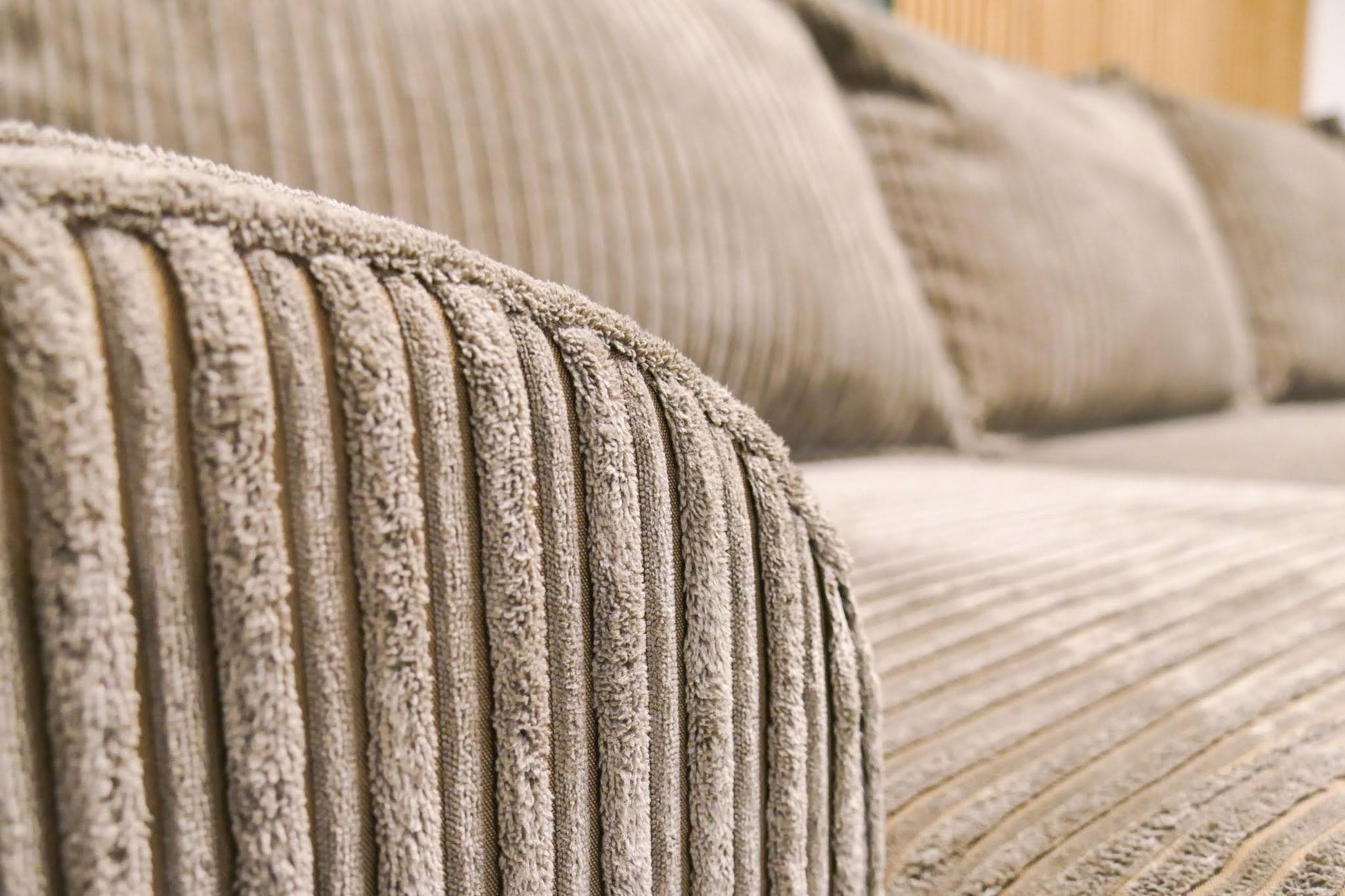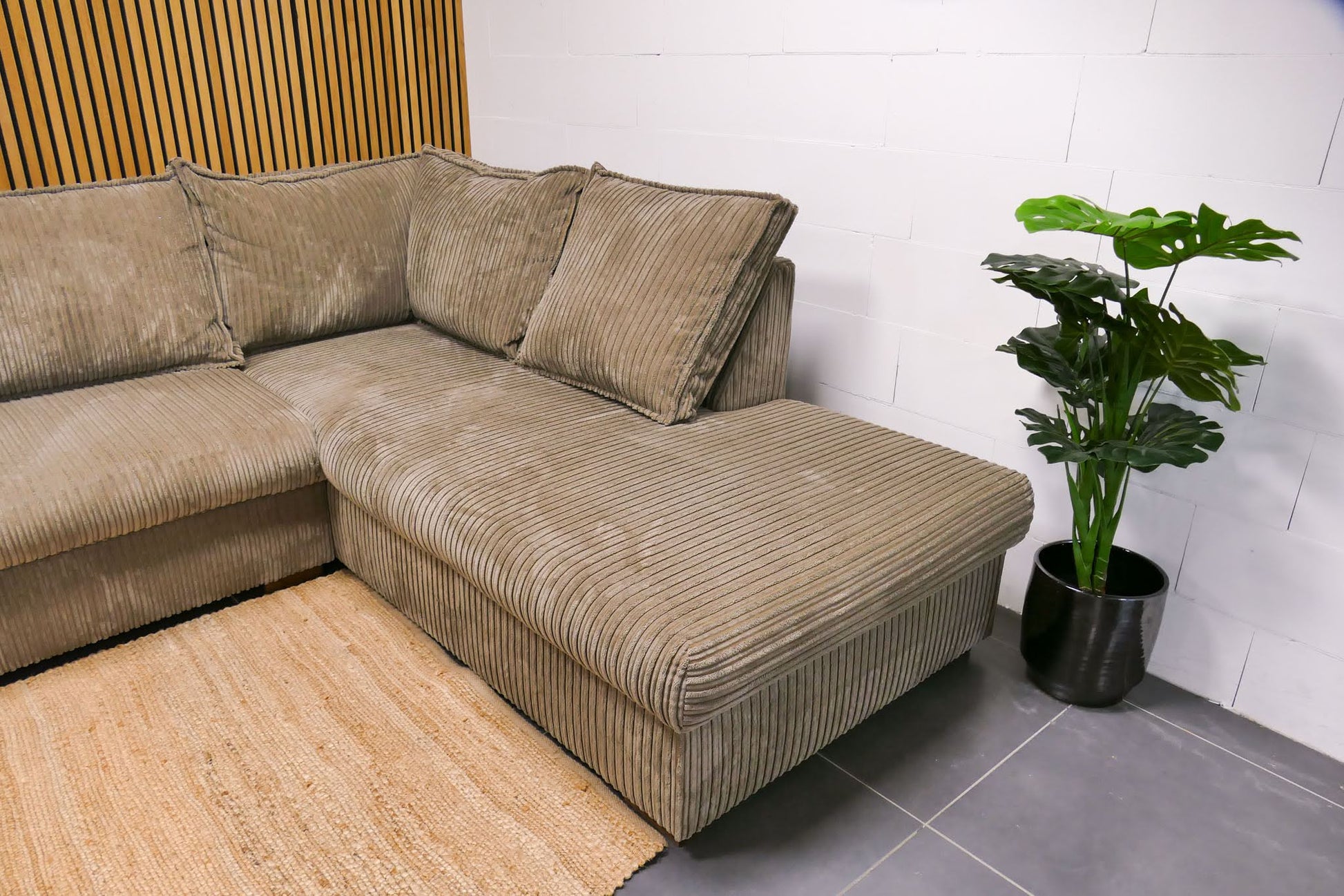 Ruime bruine U-bank in sterke ribstof met afneembare rugkussens en een comfortabele, ondersteunende zit. De bank verkeert in uitstekende staat en oogt fris en verzorgd.