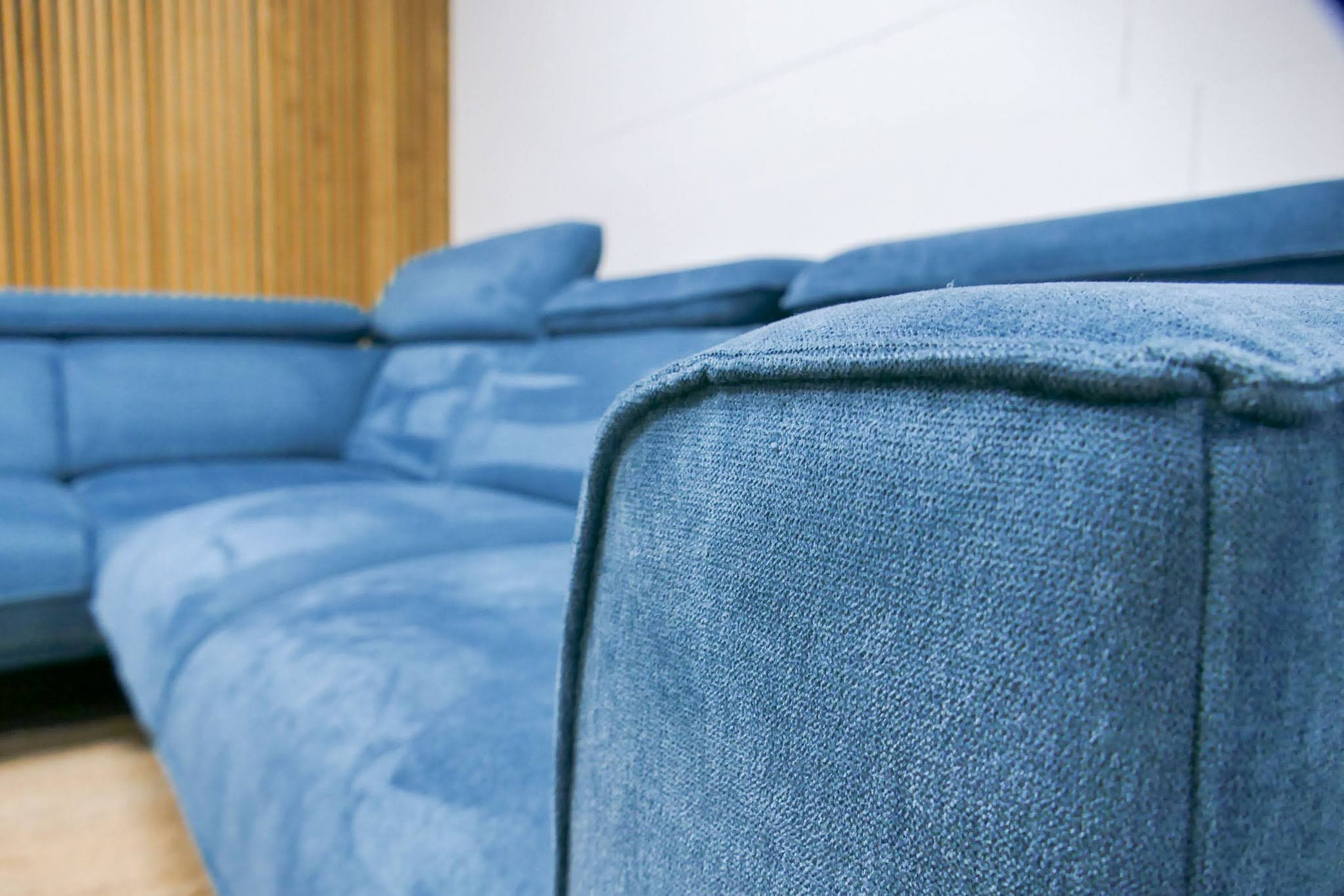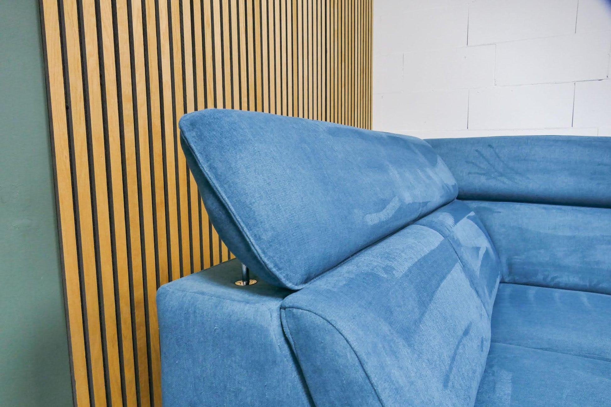 Xooon Volare hoekbank in petrolblauwe uni stof met verstelbare rug- en hoofdsteunen. Opgevuld voor langdurig zitcomfort en uitgevoerd in een modern design.